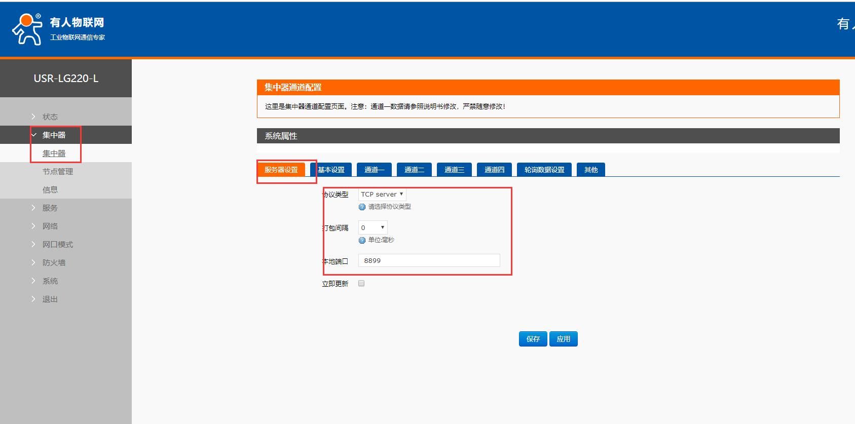 6、设置集中器的应用ID,依次点击集中器,基本设置,应用ID(206设置的应用ID),设置应用ID和lora相同。最后保存应用。工作模式以节点主动上报为例。