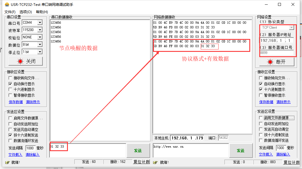节点模块串口接小黄人串口网络调试助手,正确打开串口, 节点会接收到唤醒数据,节点上报数据后,集中器根据协议格式向服务器上报数据,协议内容可阅读集中器说明书23页了解详情。