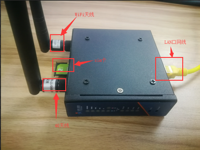 2、 接线:电脑通过网线连接 USR-806 的 LAN 口,WiFi 天线、全频天线依次接在对应的天线接口上