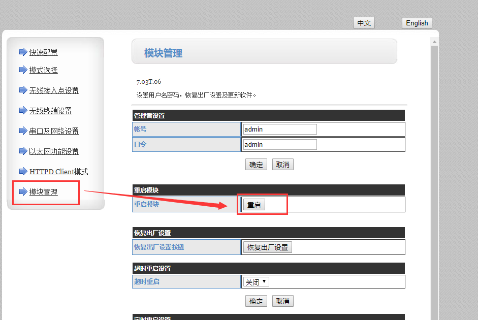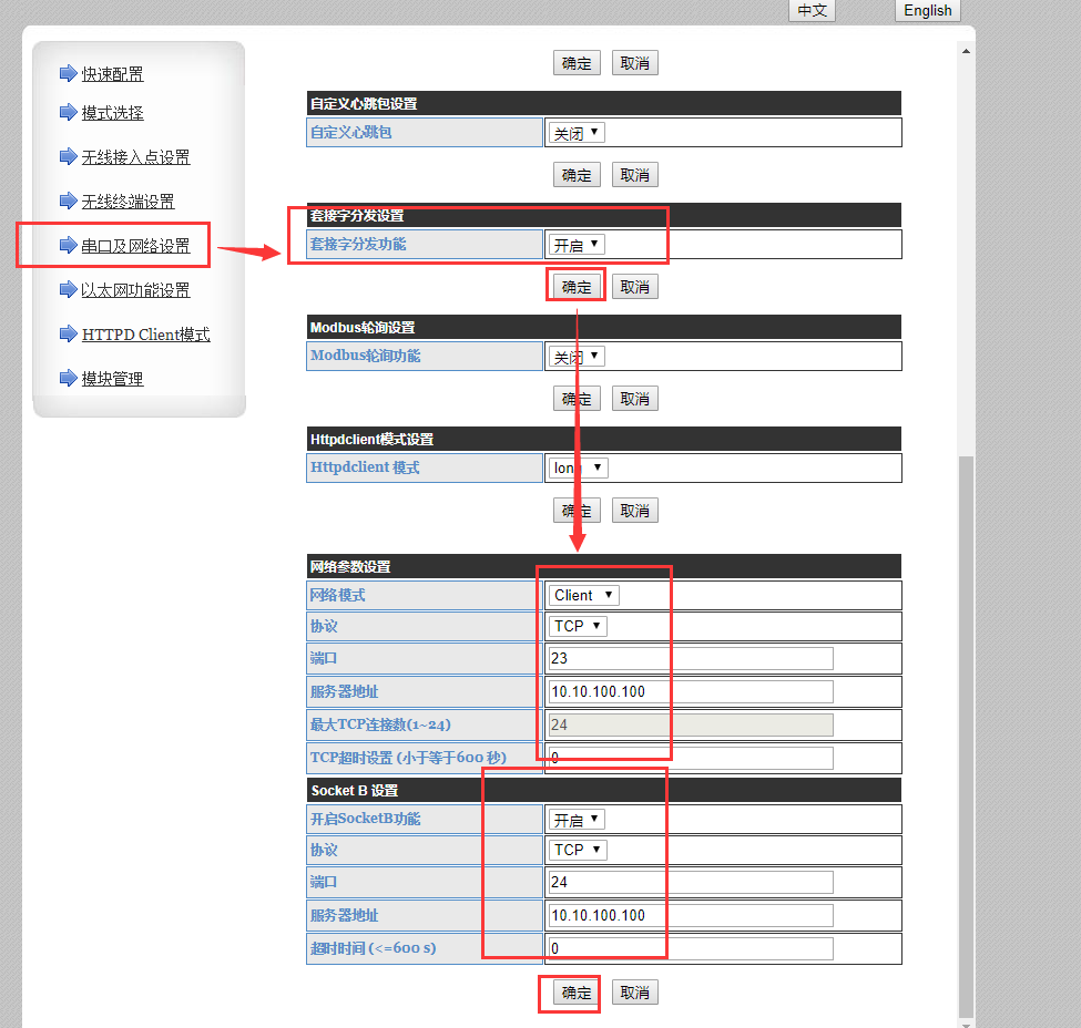 4. 网络参数设置——>网络模式选择client,协议为tcp,端口为23,服务器地址为10.10.100.100