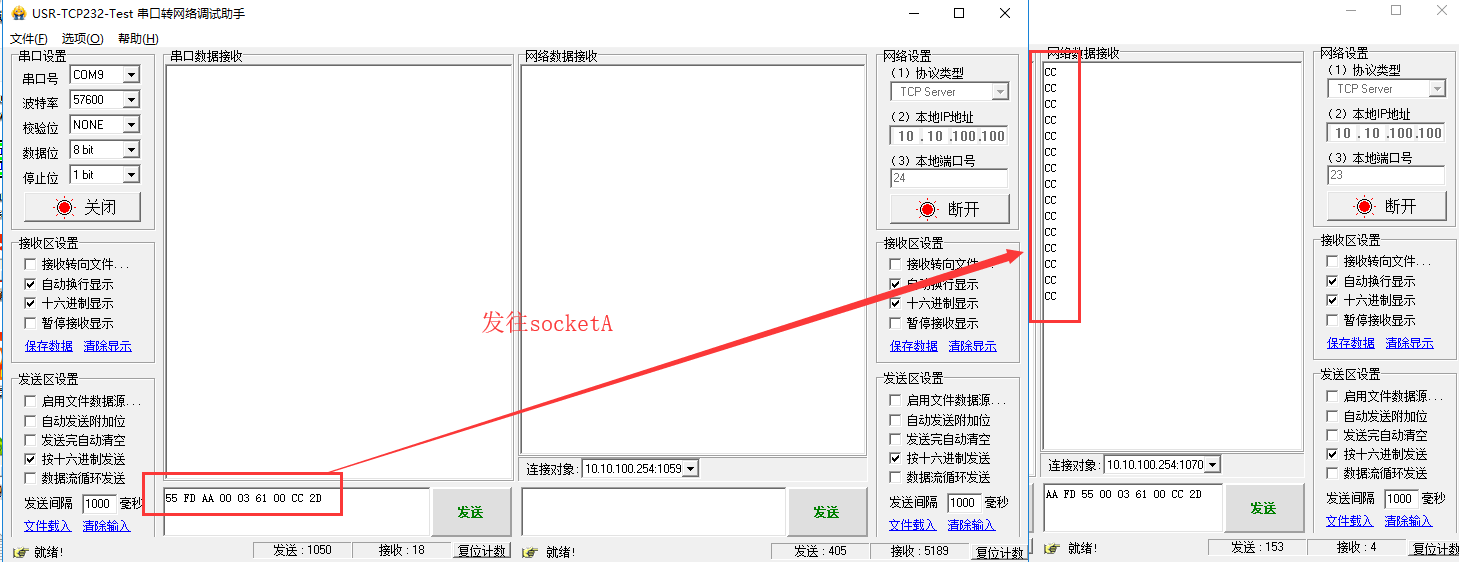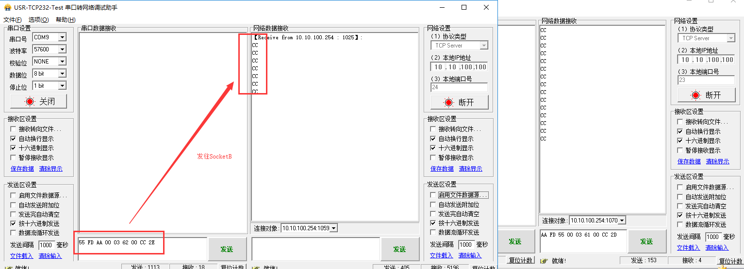SocketA和B都重新断开,重新连接,都可以给串口端发送数据!如图所示