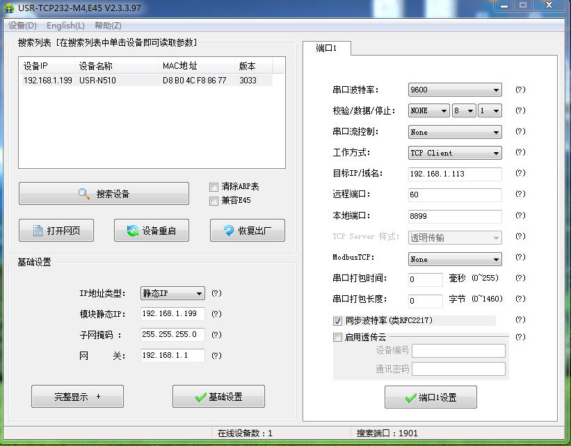 串口服务器USR-N510网线和电脑直连,IP设置同网段,在电脑用M4设置软件去搜索USR-N510的IP,设置USR-N510的参数,做TCP client。远程服务器地址填电脑IP,远程端口填电脑server端口。