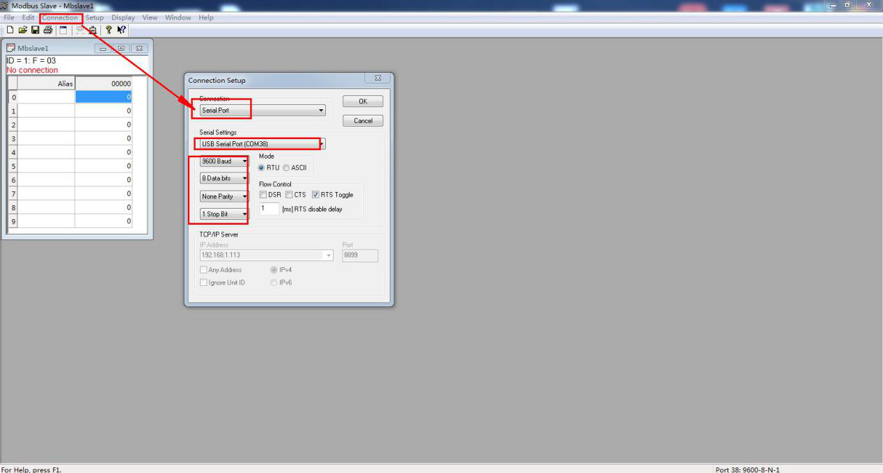 USB-RS232或者USB-RS485串口线接USR-TCP232-304串口和电脑USB口,MODBUS SLAVE软件打开COM口,模拟客户串口MODBUS RTU设备。USR-TCP232-304网线和电脑直连,IP设置同网段,在电脑安装USR-VCOM虚拟串口软件和组态王。模拟调试,用组态王连接串口服务器,去读取串口设备数据。