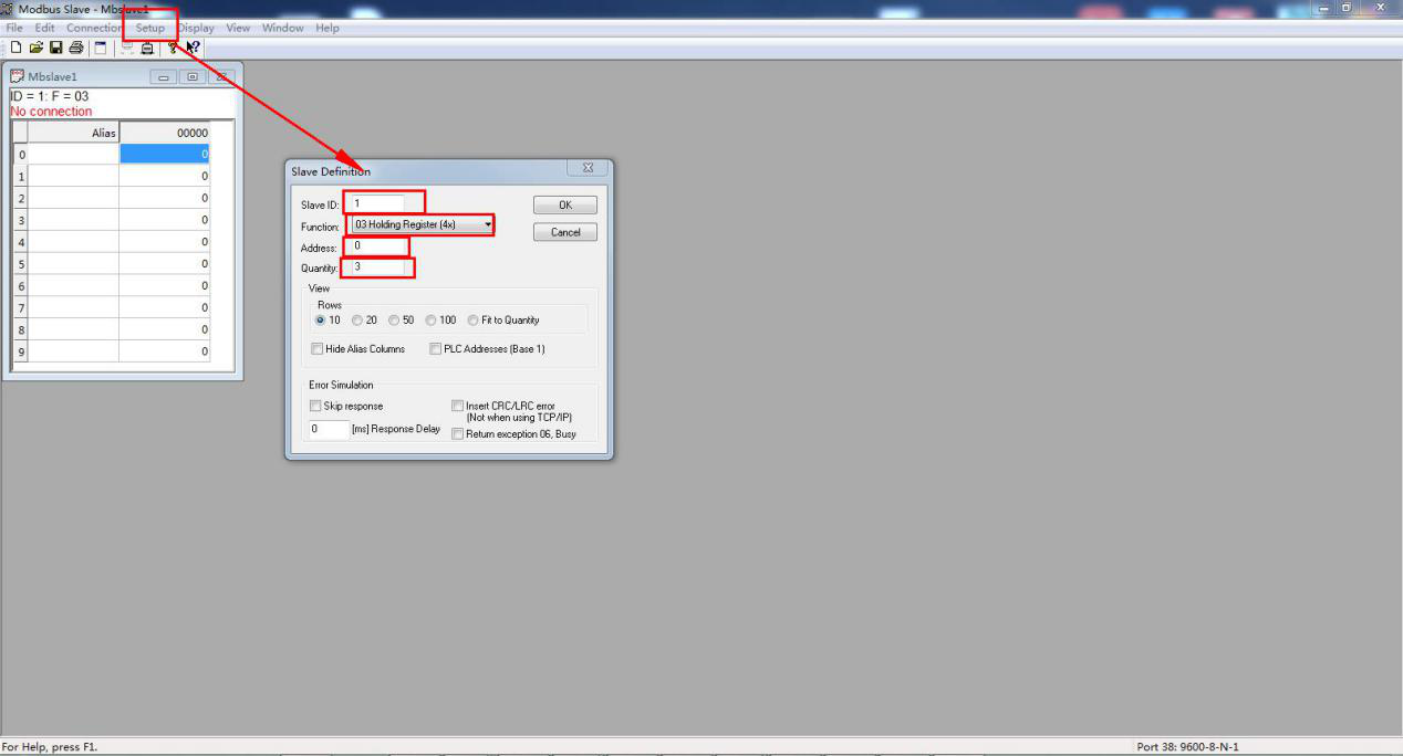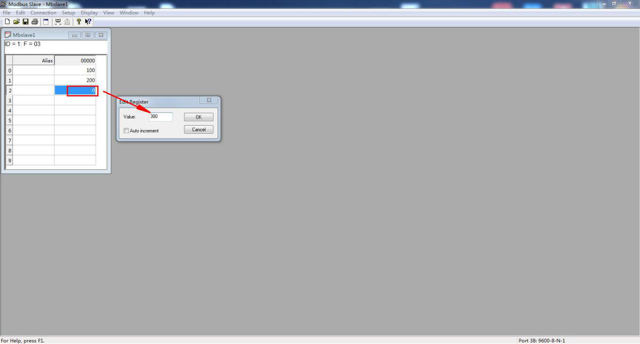SLAVE ID设置为1,模拟串口设备ID 1。用03功能码。寄存器起始地址设置0(十进制)。寄存器地址数量是3。点击寄存器地址,可以修改寄存器地址中的参数,依次先设置100、200、300。