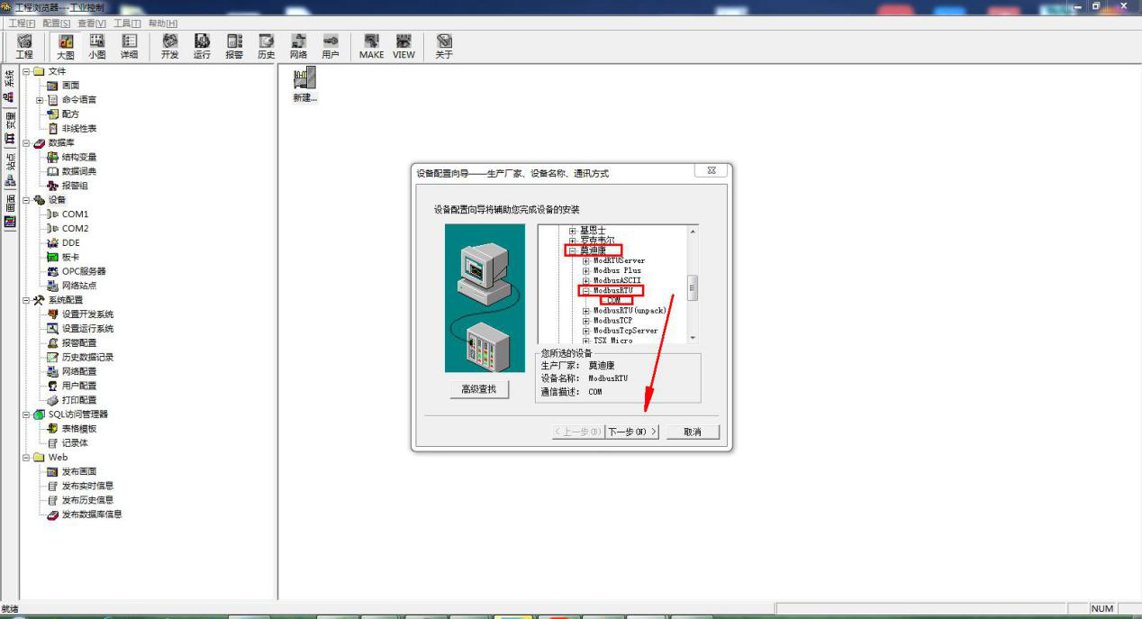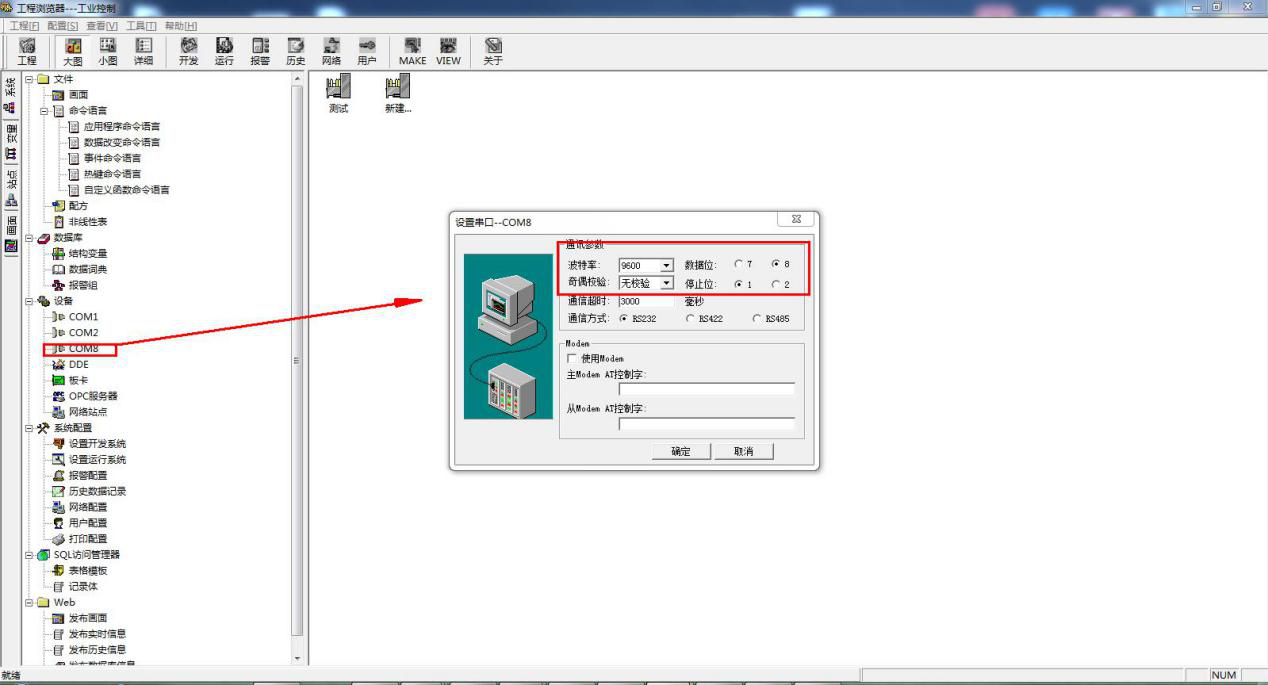 点击设备,新建一个组态设备,选择 Modbus RTU 标准协议的莫迪康 PLC。 下一步,选择使用虚拟串口 COM8,下一步输入设备ID 1。点击新建的COM8设备,还可以修改串口参数,设置和USR-TCP232-304的串口参数一致。通讯方式可以根据串口设备,选择RS232或者RS485。