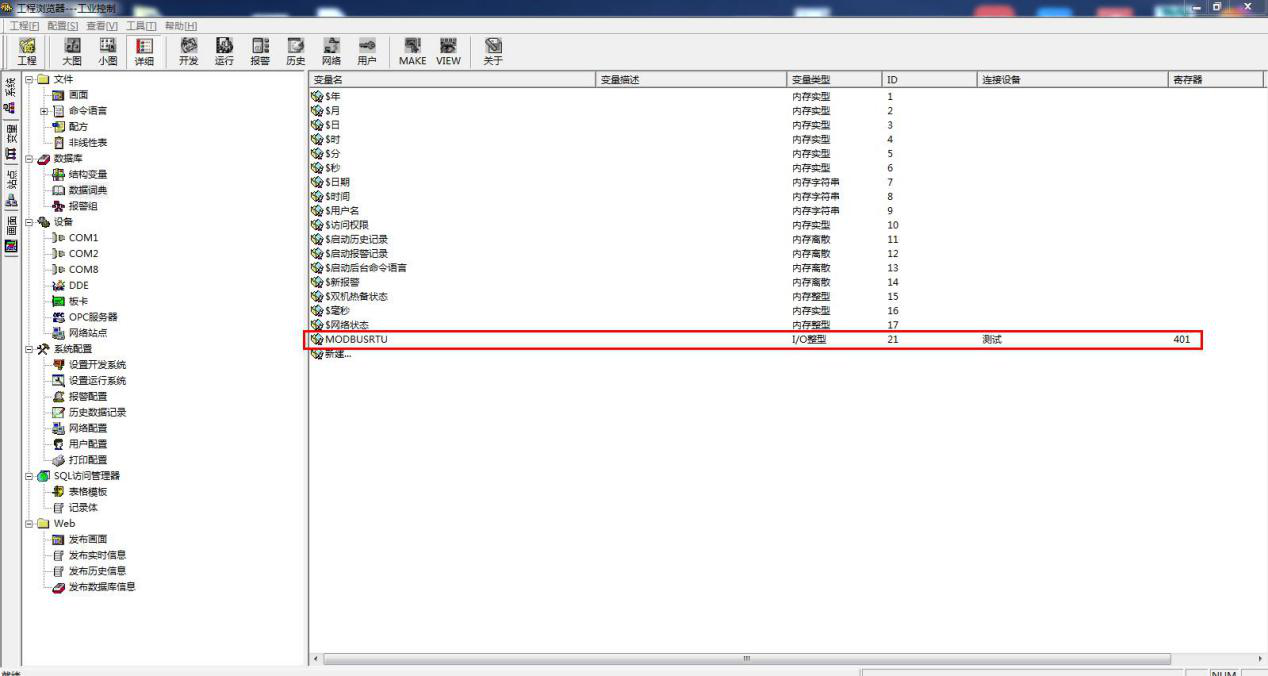 新建变量名 MODBUSRTU,选择变量类型 IO 整数。连接设备为新建的设备名:新建 IO 设备,寄存器 401,代表功能码为 03,起始地址 0 的第一个值
