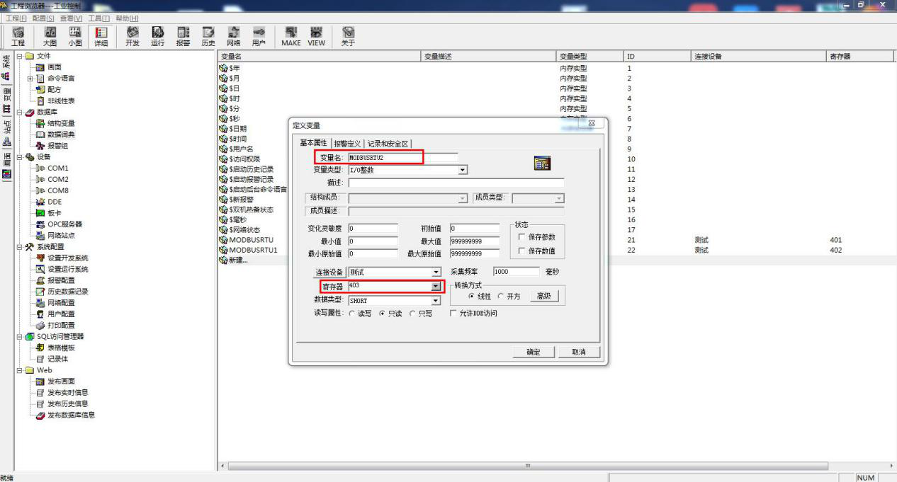 新建变量 MODBUSRTU2,选择变量类型 IO 整数。连接设备为新建的设备 名:新建 IO 设备,寄存器 403,代表功能码为03,起始地址 0 的第三个值。