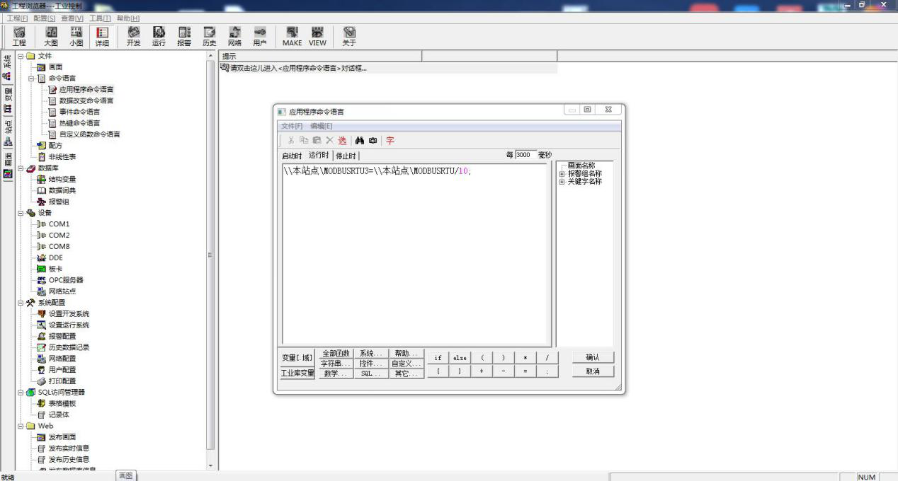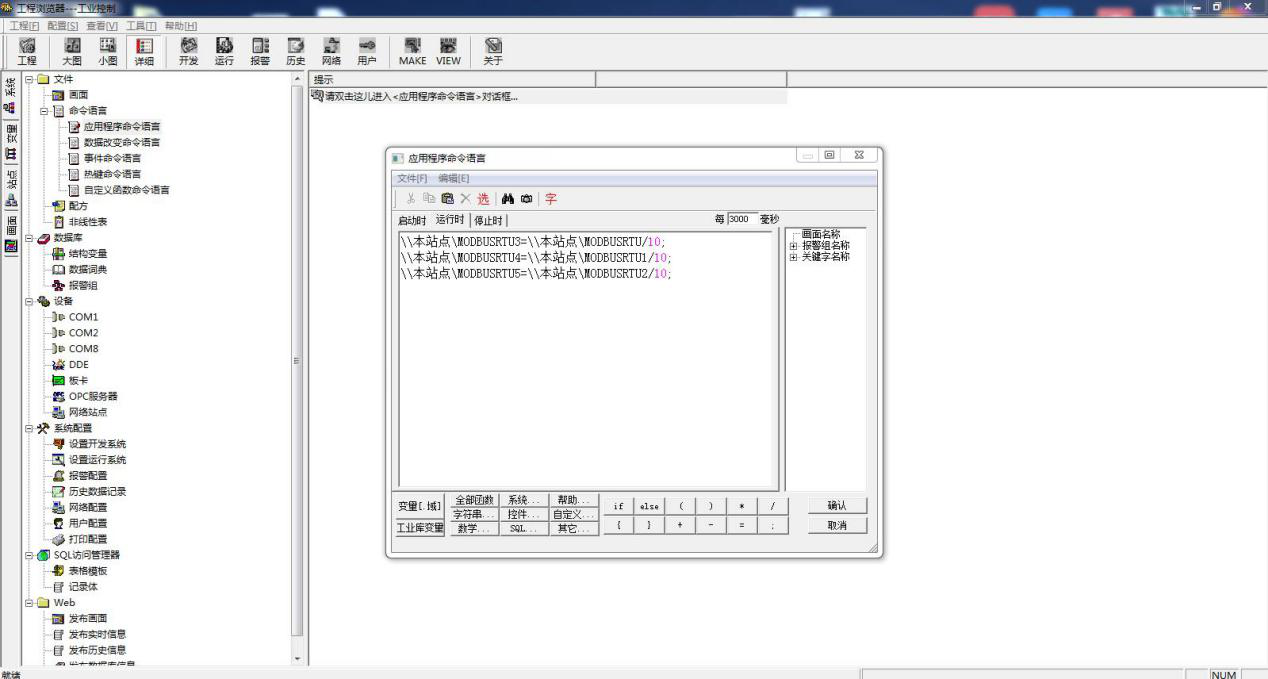 选择命令语言的应用程序命令语言。然后输入算法,MODBUSRTU 变量名 采集到的数据除以 10,然后将数据赋值给 MODBUSRTU3,此变量对应的是实 际的串口设备寄存器0地址中数据值。MODBUSRTU1 变量名采集到的数据除以 10,然后将数据赋值给 MODBUSRTU4,此变量对应的是实 际的串口设备寄存器1地址中数据值。MODBUSRTU2 变量名采集到的数据除以 10,然后将数据赋值给 MODBUSRTU5,此变量对应的是实 际的串口设备寄存器1地址中数据值。
