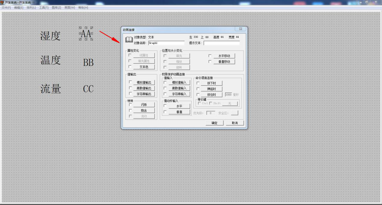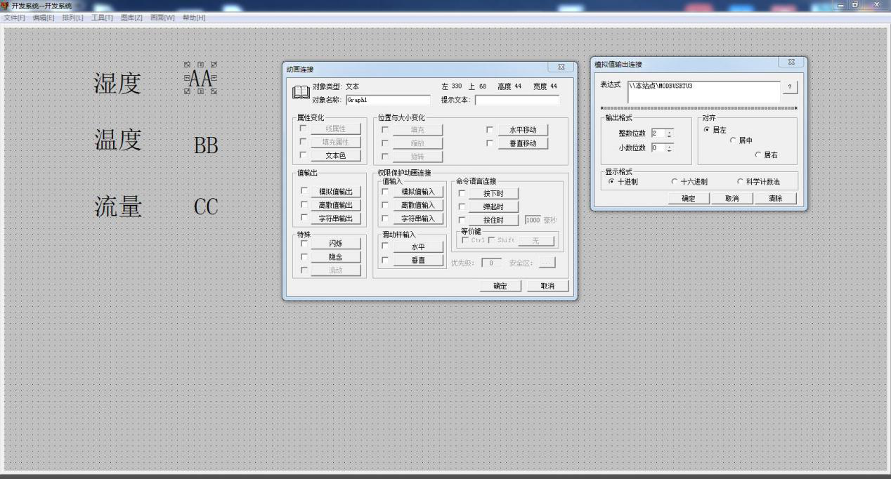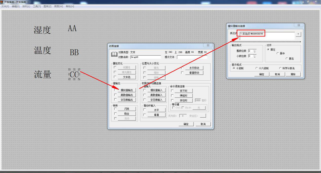 双击其中一个文本 CC,然后点击模拟值输出,在表达式内选择变量名 为 MODBUSRTU5,然后确定。意思是MODBUSRTU5 的值是设备寄存器地址2中的数据值,然后将数值 传到画面CC