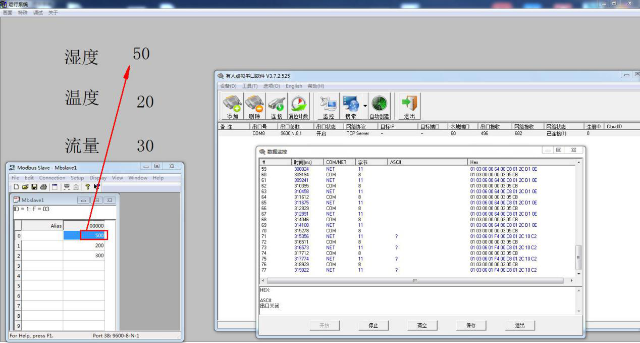 MODBUS SLAVE软件修改3个寄存器地址数据,组态王读取到串口设备3个寄存器地址数据,在页面上显示。