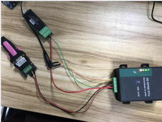 (1) 硬件连接:装上sim卡,接上天线,G726的串口通过USB转RS232或者USB转RS485接到PC上,用我司提供的适配器供电。带白条的那根线是正极,带字母的那根线是负极。如下图所示。(图中连接了232和485,客户在实际测试中只需要连接232或者485二选一即可)