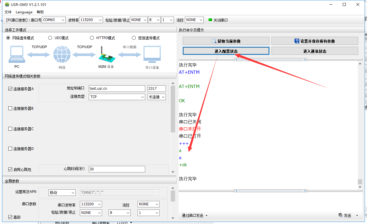的命令,点击进入通信状态(多次间隔 2 秒尝试),若能返回 ok,则证明之前在 AT 指令配