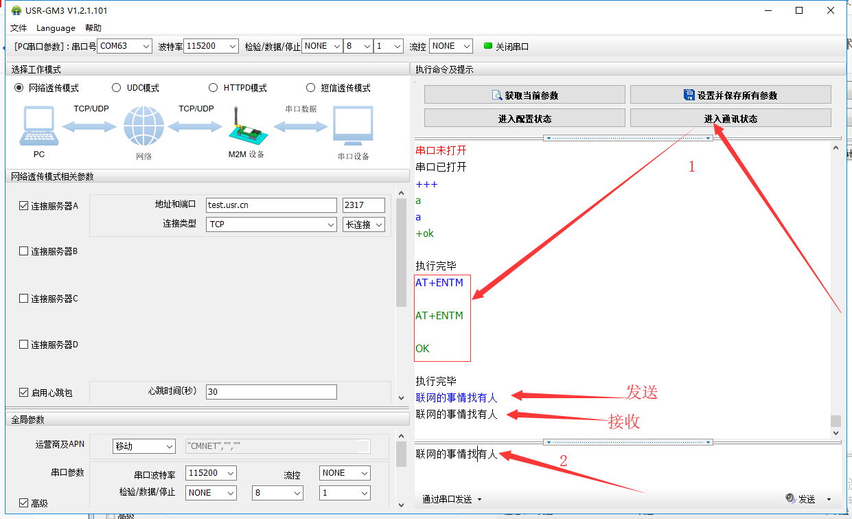 (5)DTU出厂默认连接的是我司的测试服务器:test.usr.cn:2317;串口向服务器发送什么数据,服务器就将接收到的数据返回到串口。