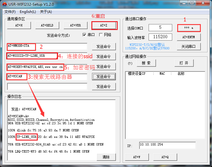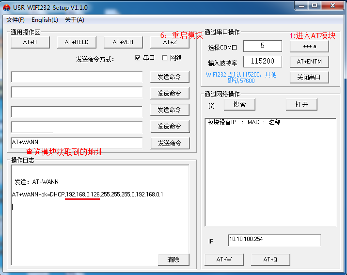 9:使用AT指令设置模块加入路由器的步骤详解:使用AT+WANN可以查询到模块获取到的IP地址。通信地址就使用这个IP,该指令要在模块设置以上指令重启之后,再去使用这个指令才能生效。