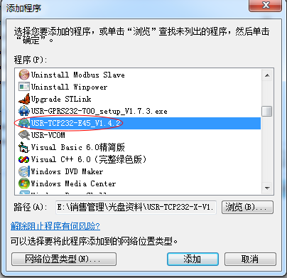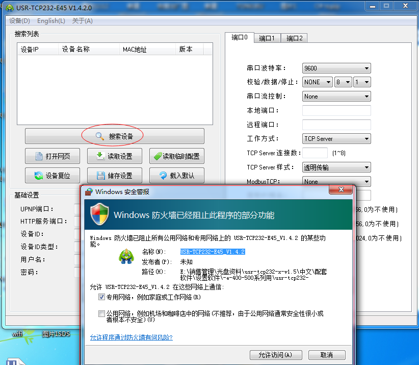 1:当开启防火墙之后,打开USR-TCP232-E45串口服务器搜索软件。会出现防火墙阻止的提示。
