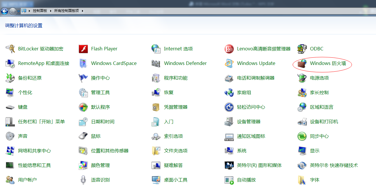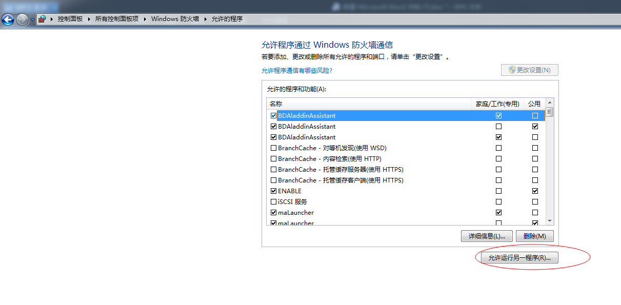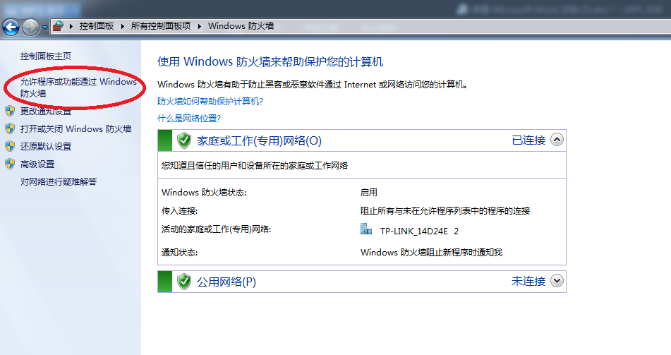 打开防火墙,防火墙是开启的,单击 允许程序或者功能通过windows防火墙。
