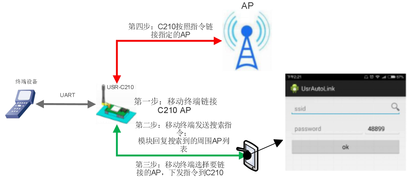 模块工作在 AP 模式下时,会开启一个用于接收快速联网协议命令的 UDP 端口,端口号为 48899(与局域网搜索端口相同,可设置)。电脑或手机可与模块 Wi-Fi 网络直连,通过 UDP 协议下的指令,查询 SSID 信息列表和 设置路由器 SSID 及密码。设置完成后,模块会自动重启,连接至设定的路由器,此时工作在 STA 模式。