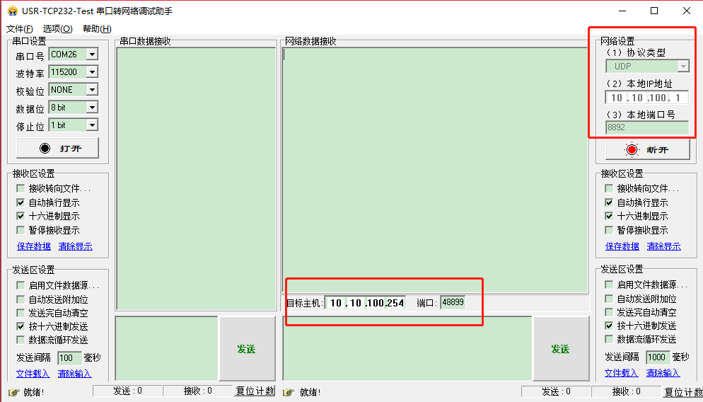 b. 打开USR-TCP232-Test串口与网络调试助手,网络设置 - 协议类型:UDP,