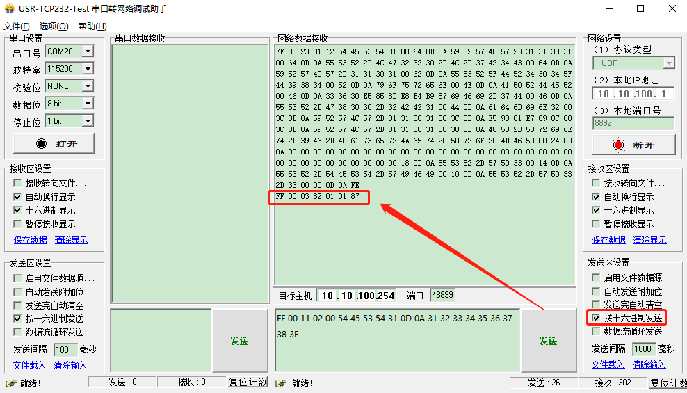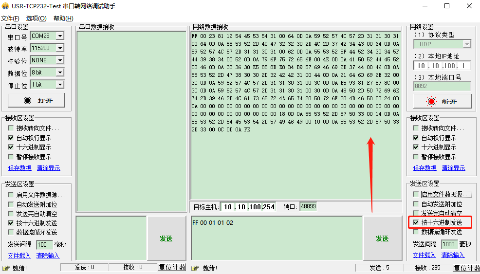 设置目标主机为210模块自身lan口IP,默认为10.10.100.254,端口:48899