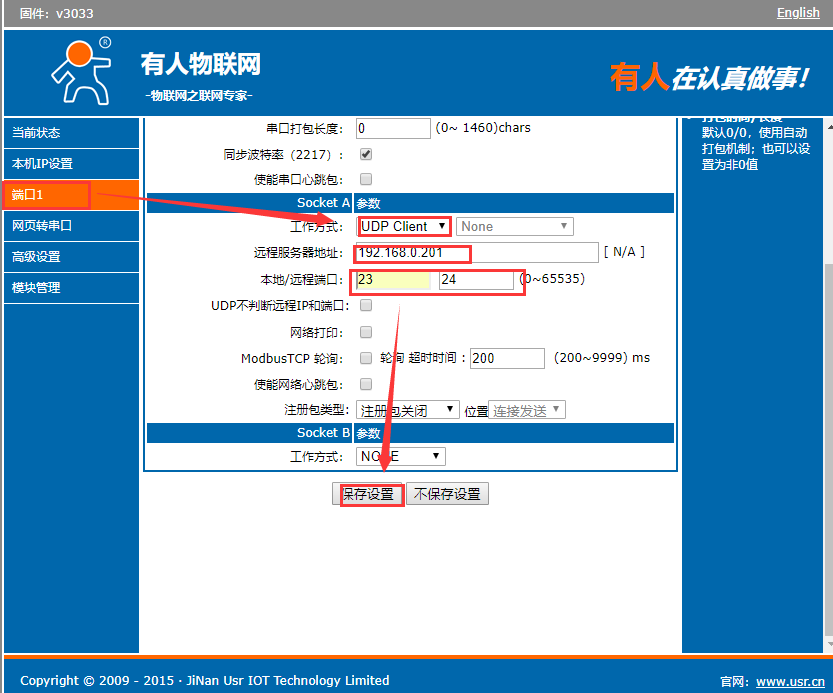 4、单击端口1,设置socket A参数,工作方式选择UDP Client,远程地址填192.168.0.201,本地端口填23、远程端口24保存设置,重启。