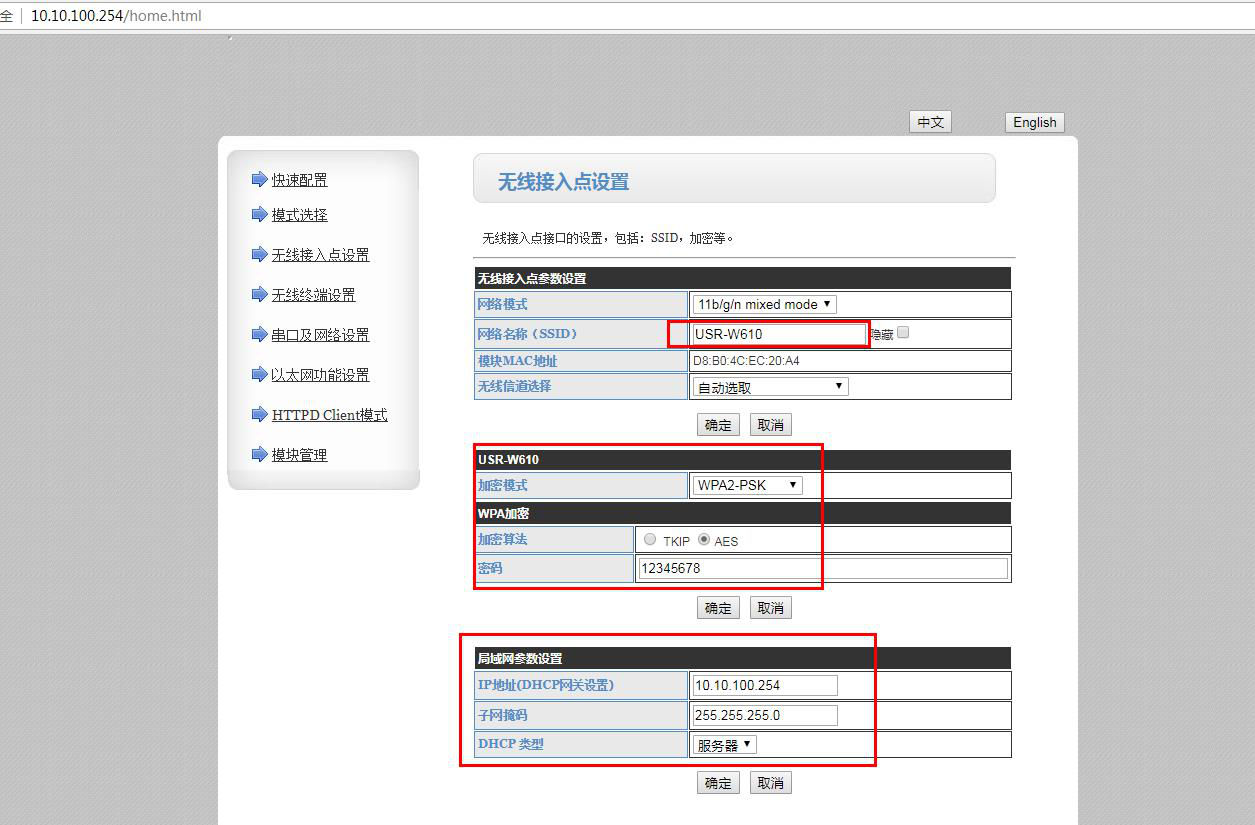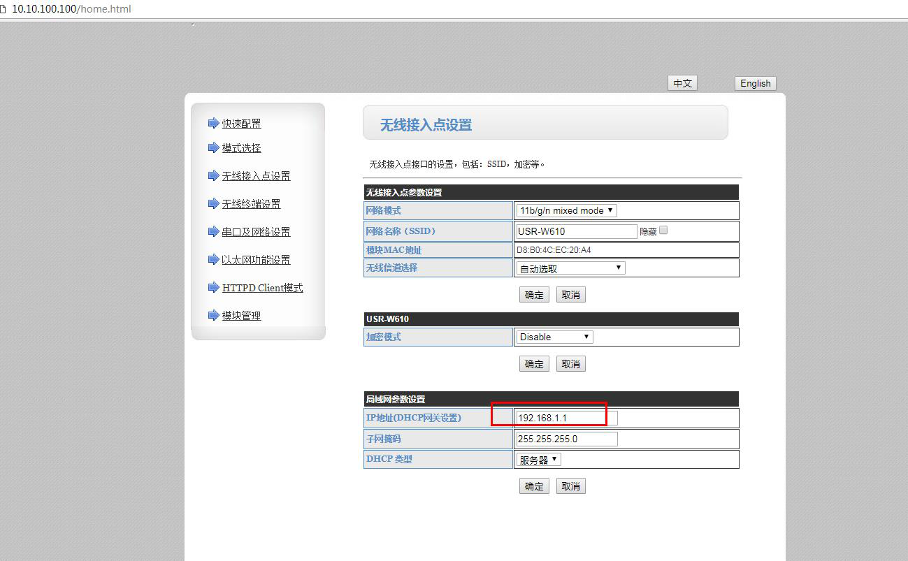 1、1号USR-W610 AP模式参数设置: