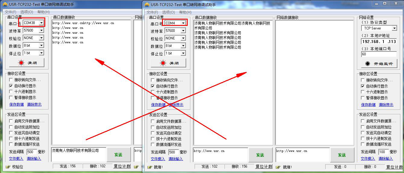 在电脑上用USR-TCP232-TEST软件测试,分别打开对应的两个COM口,测试两个串口之间相互传输数据。