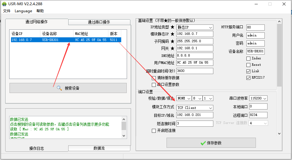 点击“搜索设备”当搜索列表中出现301的设备后,单击搜索到的设备,查看其配置信息(下图为默认配置信息)。