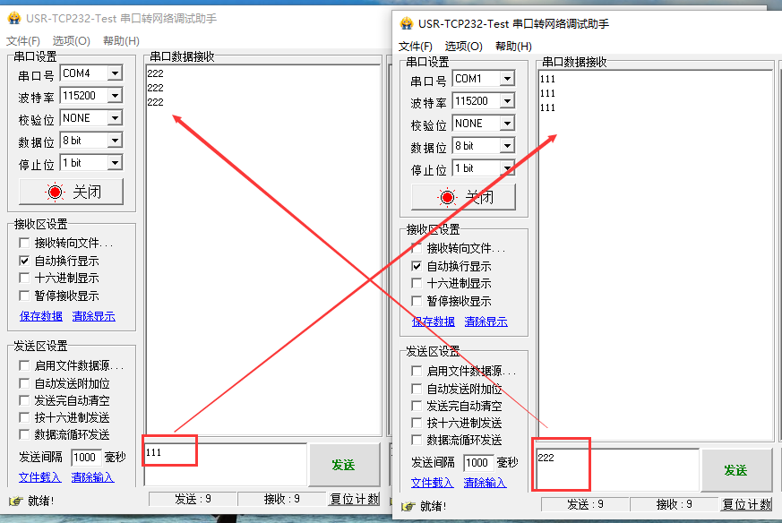 8、打开两个USR_TCP232_Test软件,一个连接COM4,一个连接虚拟串口COM1,实现两个串口直接数据互发。