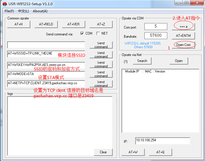 1:使用AT指令设置。设置模块连接的域名和端口,设置模块连接到可以连接互联网的路由器。模块设置为STA模式。设置软件下载链接:http://www.usr.cn/Download/91.html
