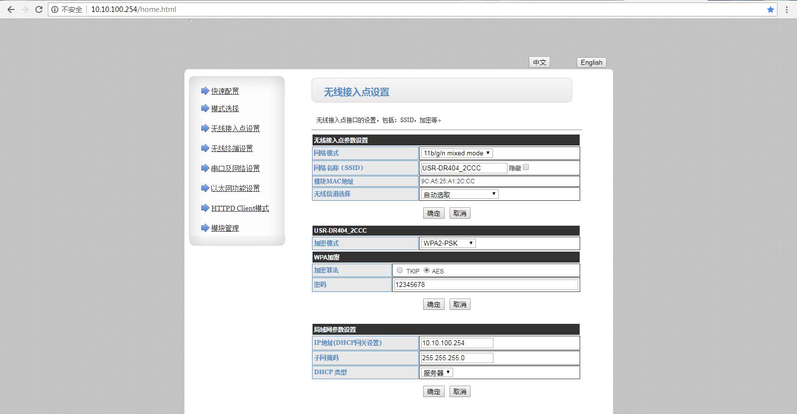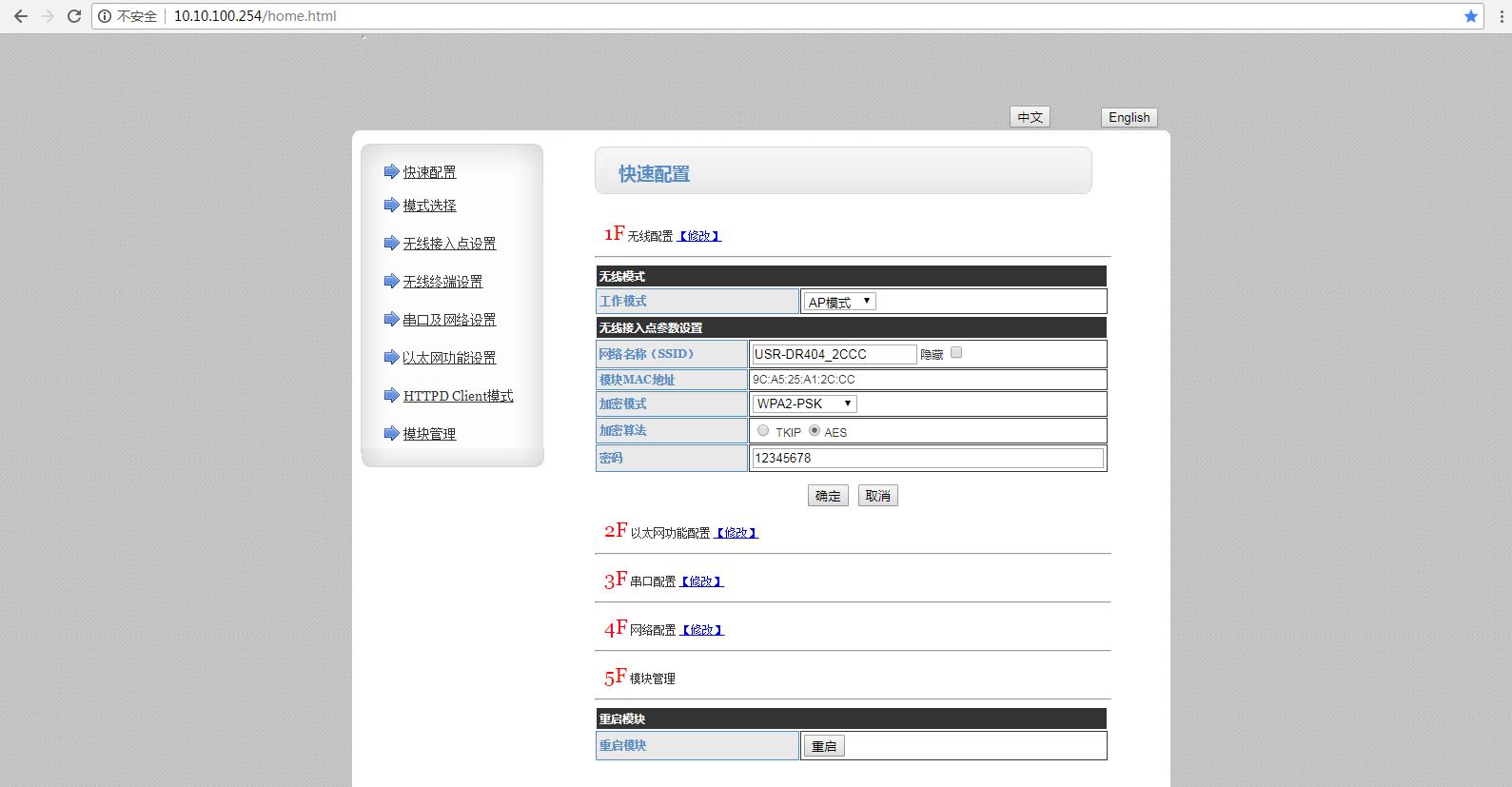 USR-DR404默认IP是10.10.100.254,用这个IP,在浏览器输入,进入USR-DR404的内置网页,可以对DR404进行参数查看和参数配置。登录用户名和密码都是admin。