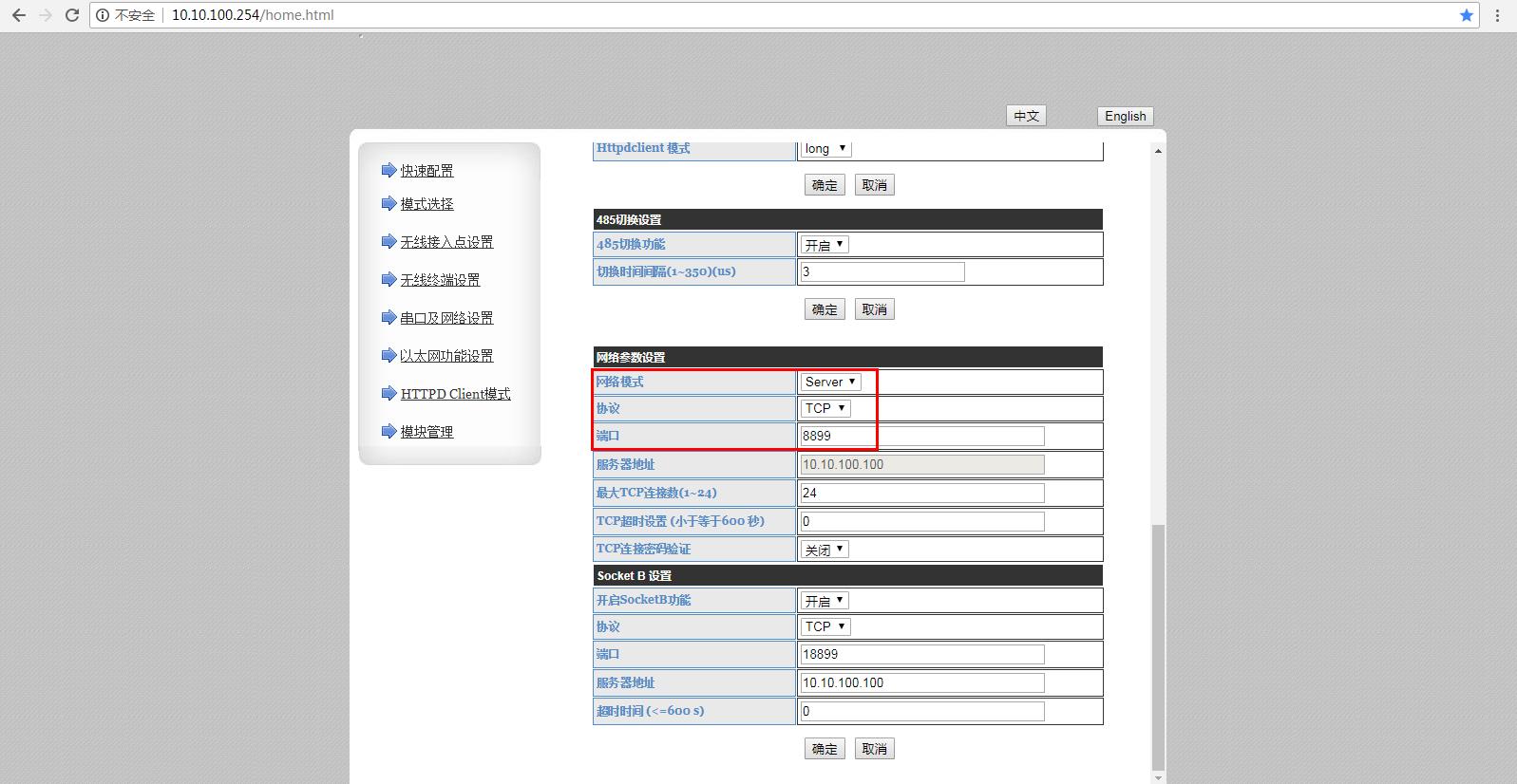 网络参数默认是TCP server工作模式,端口是8899。