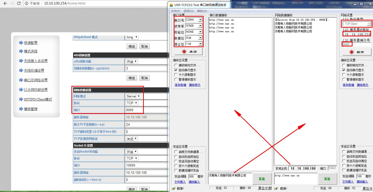 然后用USR-TCP232-TEST网络助手测试串口和网络之间的数据传输。