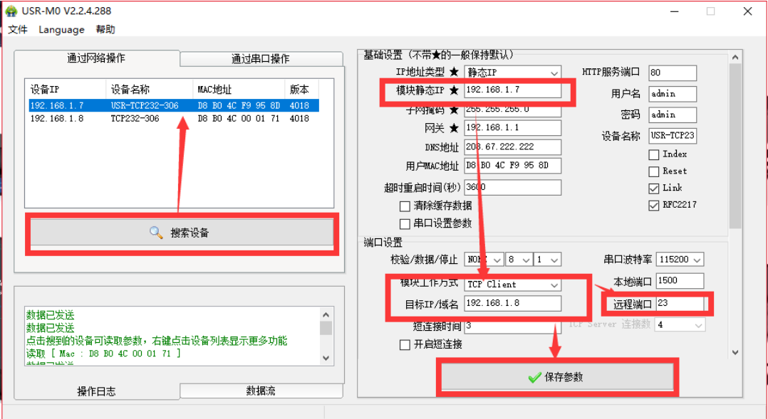 1、连线后打开MO设置软件,点击搜索设备,搜到设备后,点击进行配置,一台306做sever,设置好网口静态ip以及端口,保存参数。(连接同一交换机时静态路由必须与上级路由在同一网段,且ip不能一样)