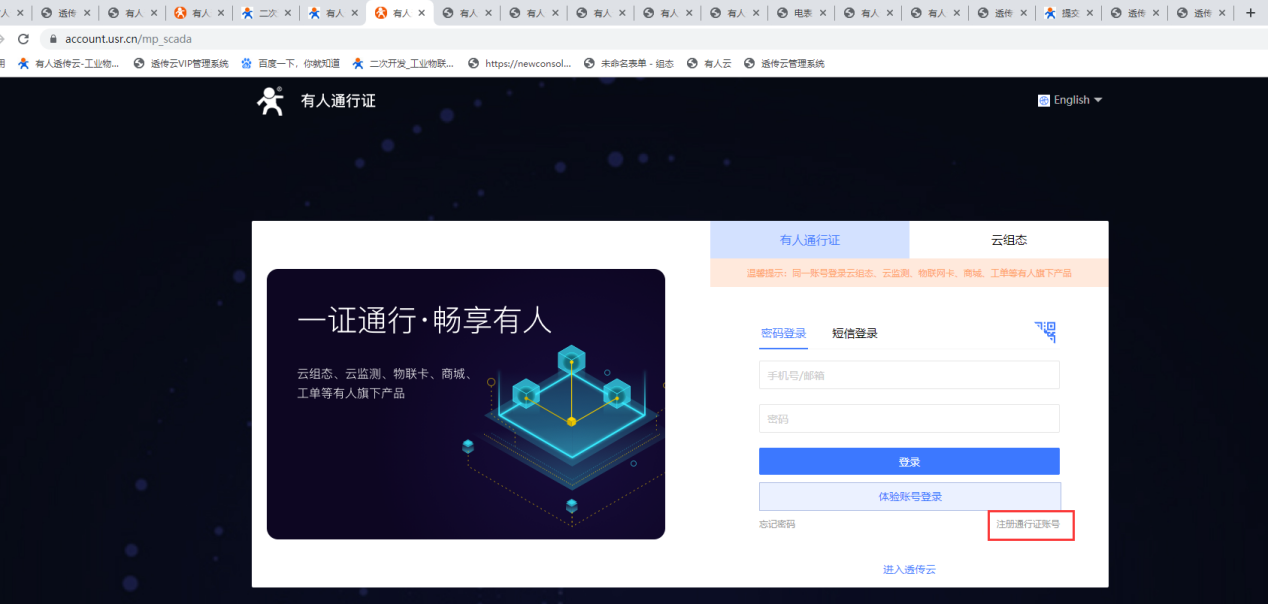 4、可以重新创建云组态,如果以前使用过透传云可以直接绑定透传云的账号,由此界面绑定物联网卡平台,工单系统,云检测,和商城;