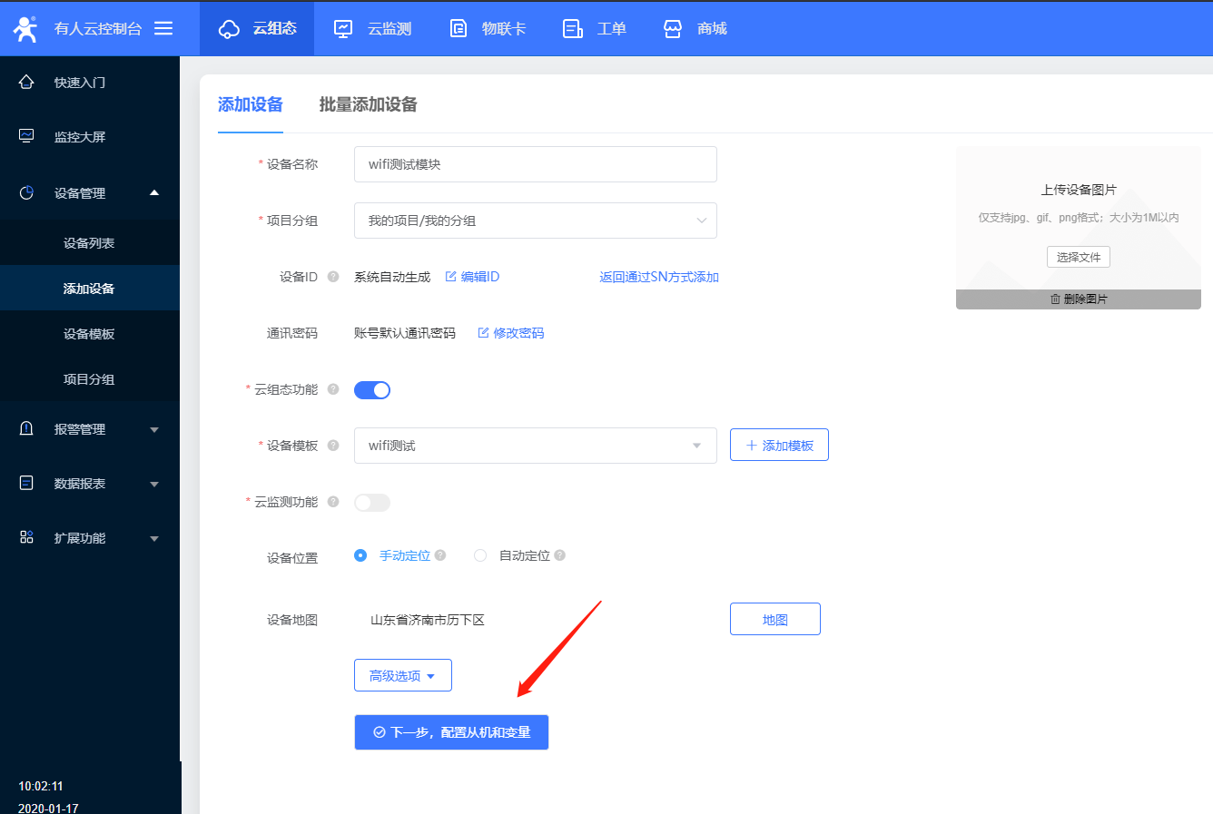 5、本次案例是C215连有人云进行数据显示,可以进入云组态,选择添加设备;