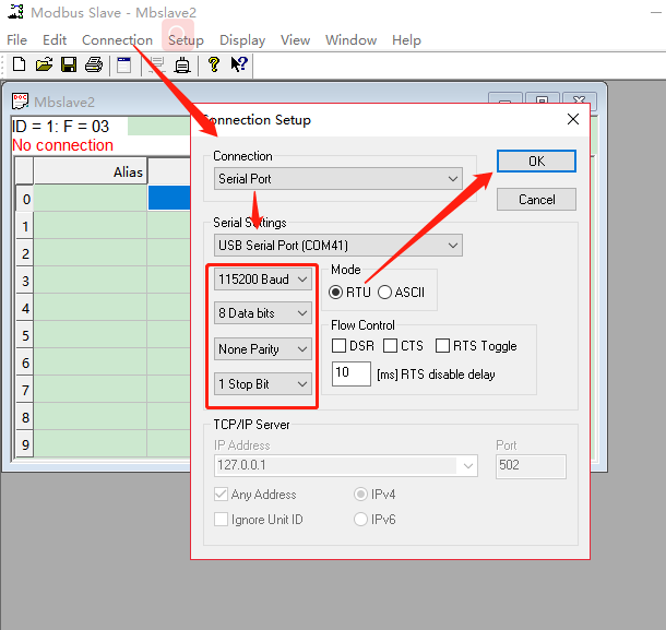 本案例测试说明:用modbus slave软件模拟modbus rtu协议的串口设备;