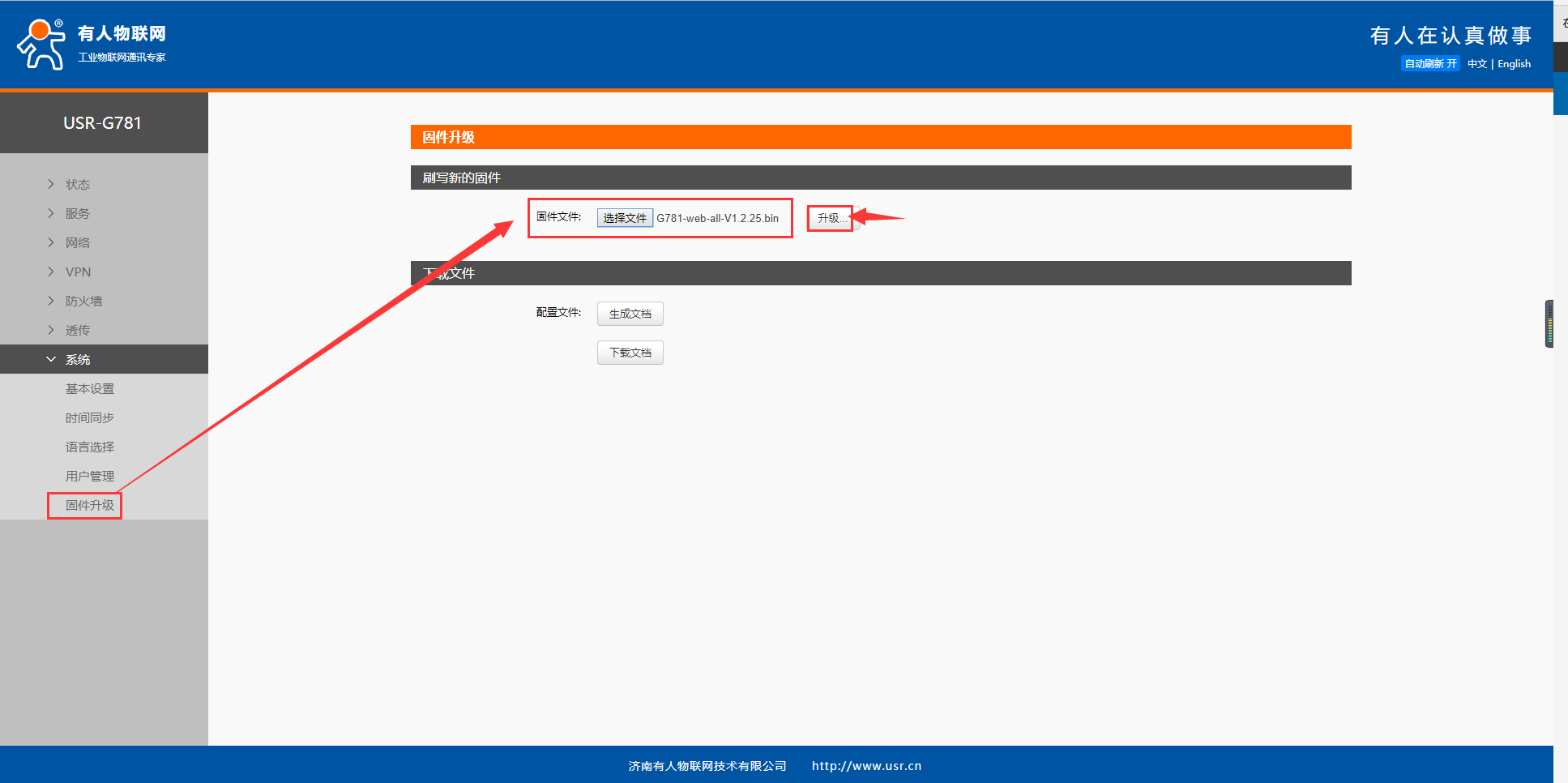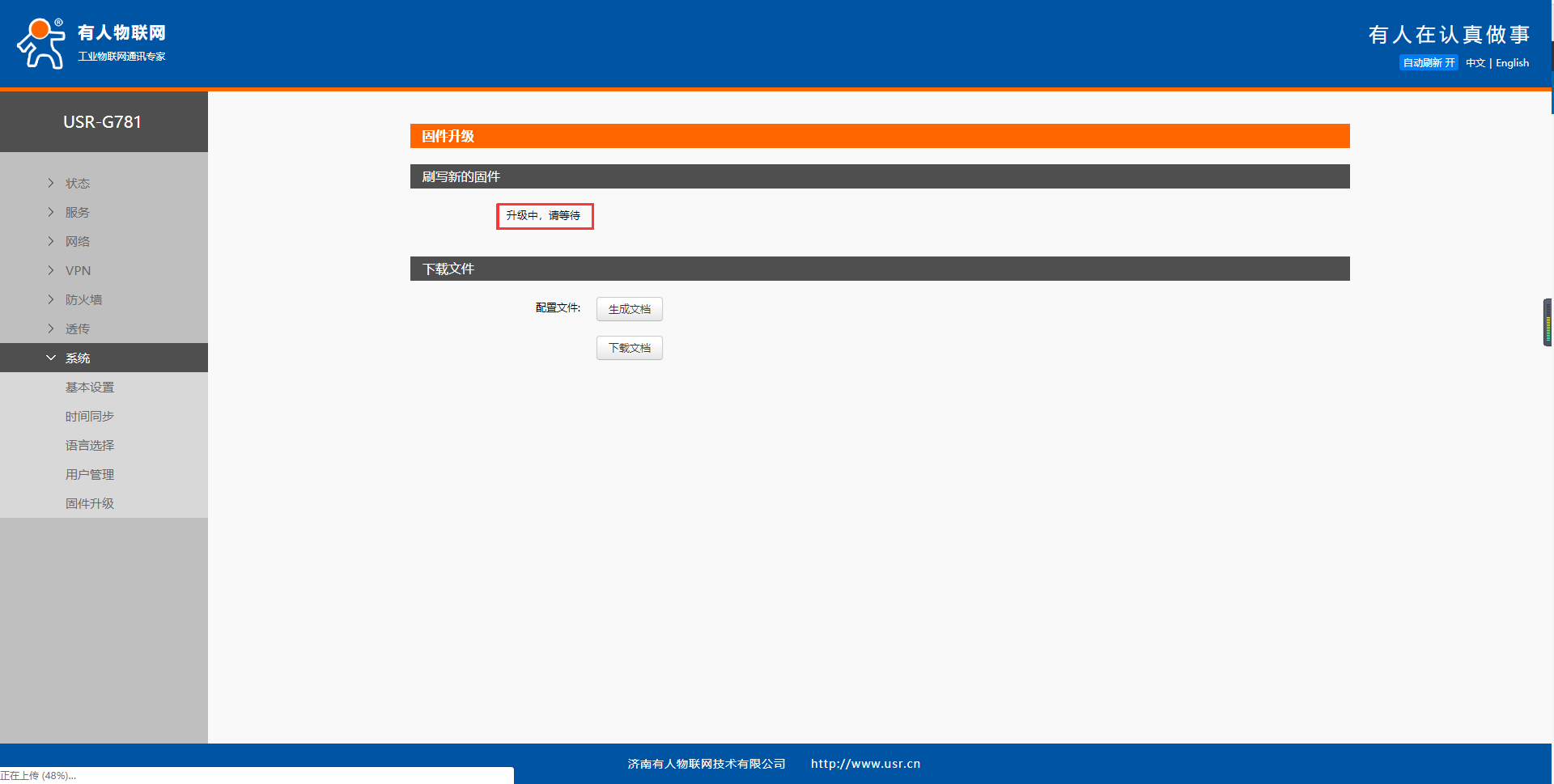 4、  进入系统----固件升级界面,选择对应的固件文件(请登录http://h.usr.cn/提交工单并备注当前固件版本和邮箱地址,技术支持会将固件文件发送至您的邮箱),点击升级,会提示正在升级。此时不要重启设备,不要断电,耐心等待约一分钟左右。设备升级固件完成后会自动重启(可观察指示灯)。