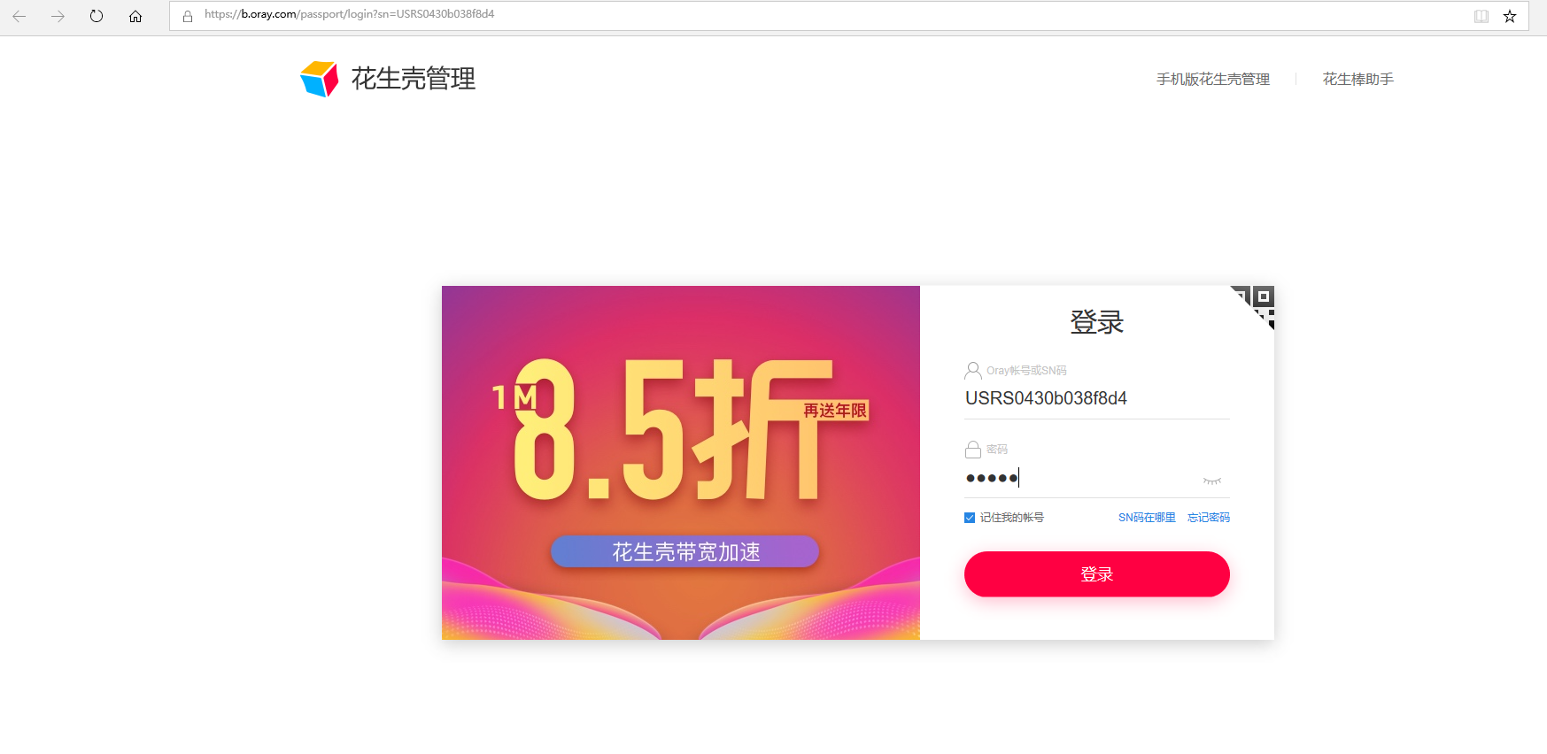 2、点击登陆管理,页面跳转到花生壳登陆页面,自动识别设备sn,默认密码admin。点击登陆。