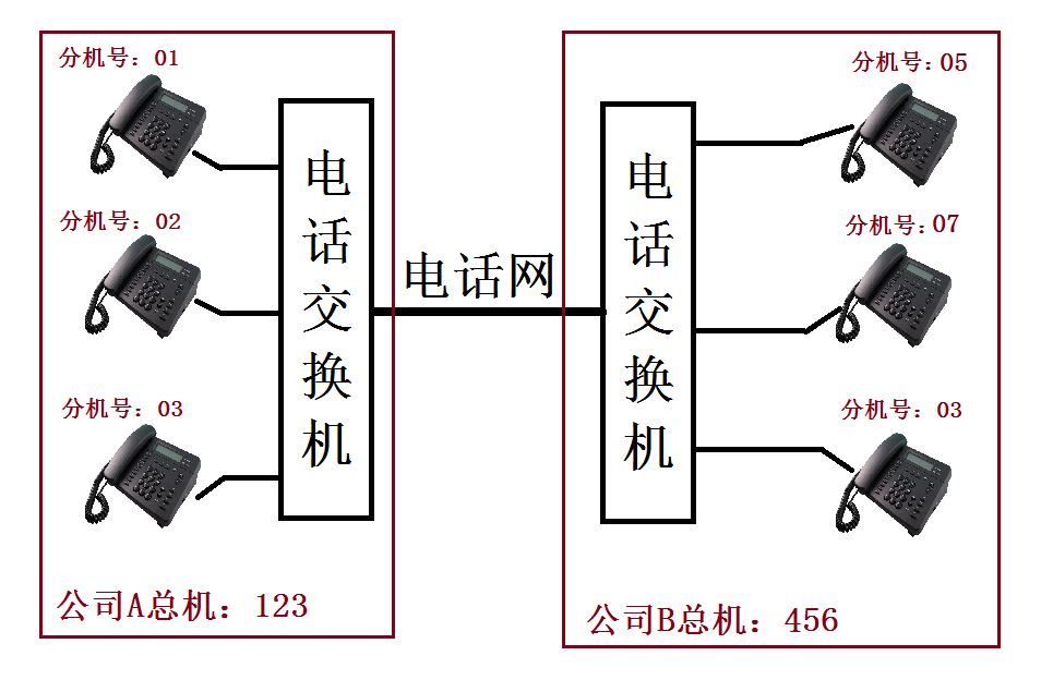 如果他直接拨打分机号03,那么只能把电话打到A公司的03分机,而无法把电话打到B公司。