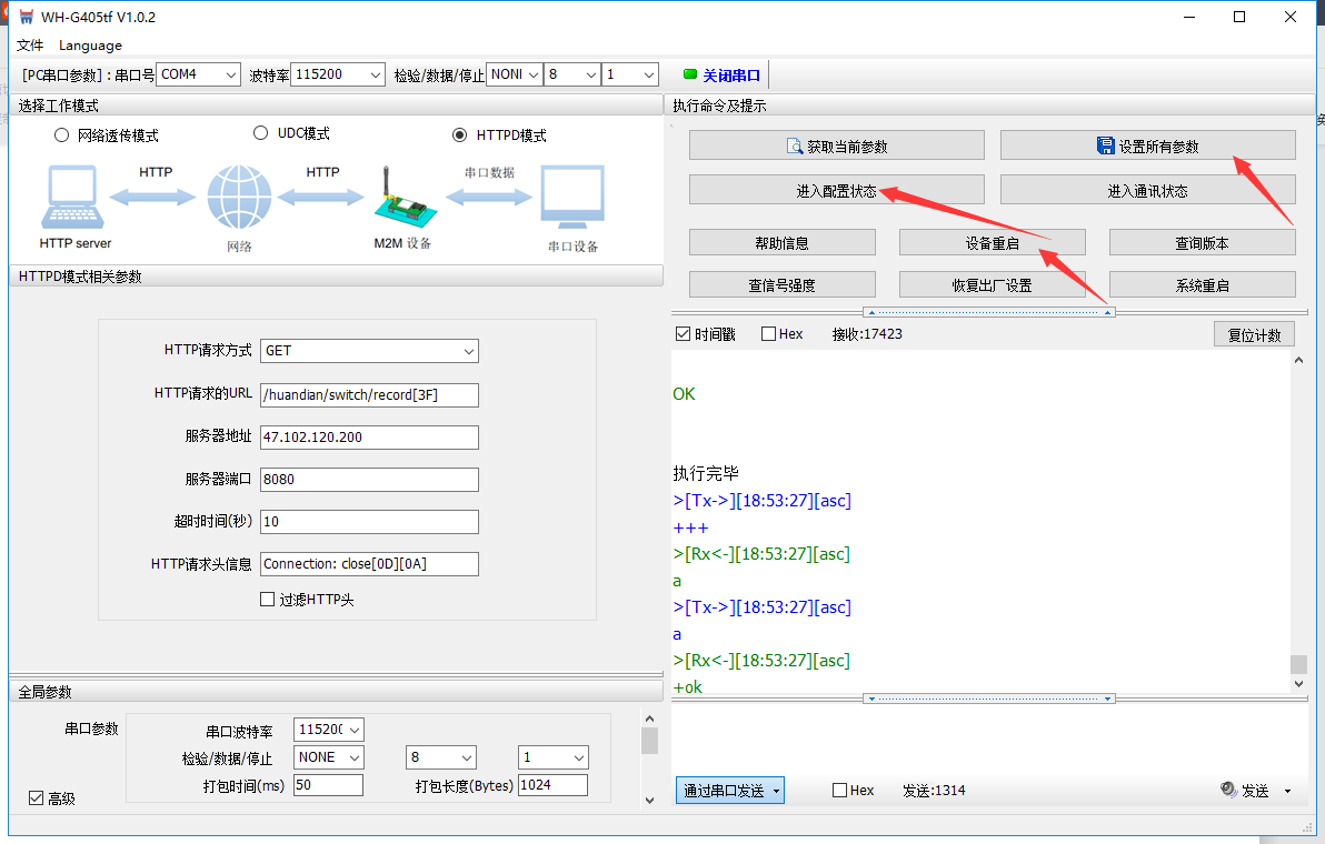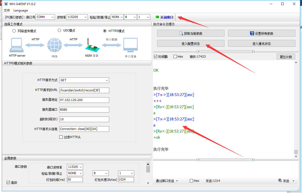 3. 是否在已经进入AT指令配置模式下重复点击进入配置状态按钮或者发送进入配置模式的命令,点击进入通信状态(多次间隔2秒尝试),若能但会ok,则证明之前在AT指令配置状态。