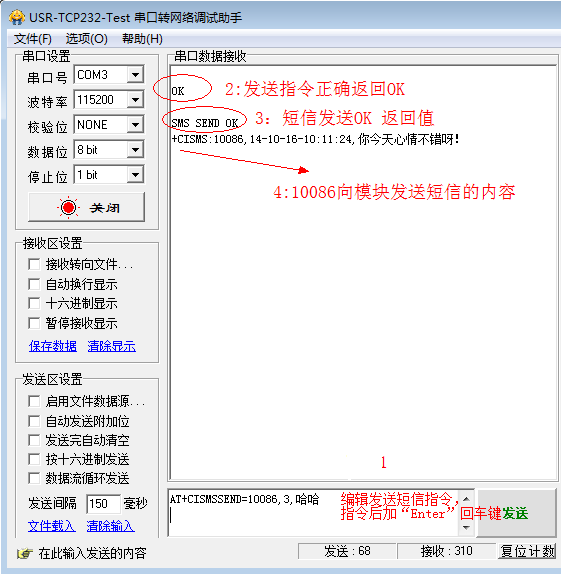 例:AT+CISMSSEND=10086,1,10086<CR><CL>