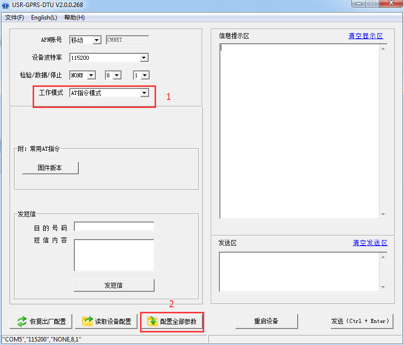 (1)模块设置为AT指令模式.重新上电之后5秒之内点击配置全部参数