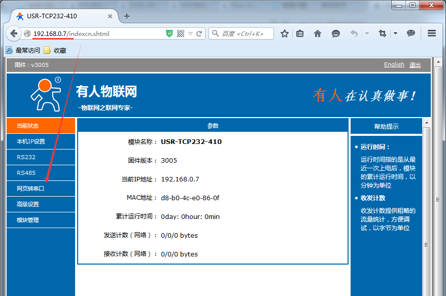 2:进入串口服务器的配置网页:192.168.0.7.用户名和密码都是admin。找到网页转串口