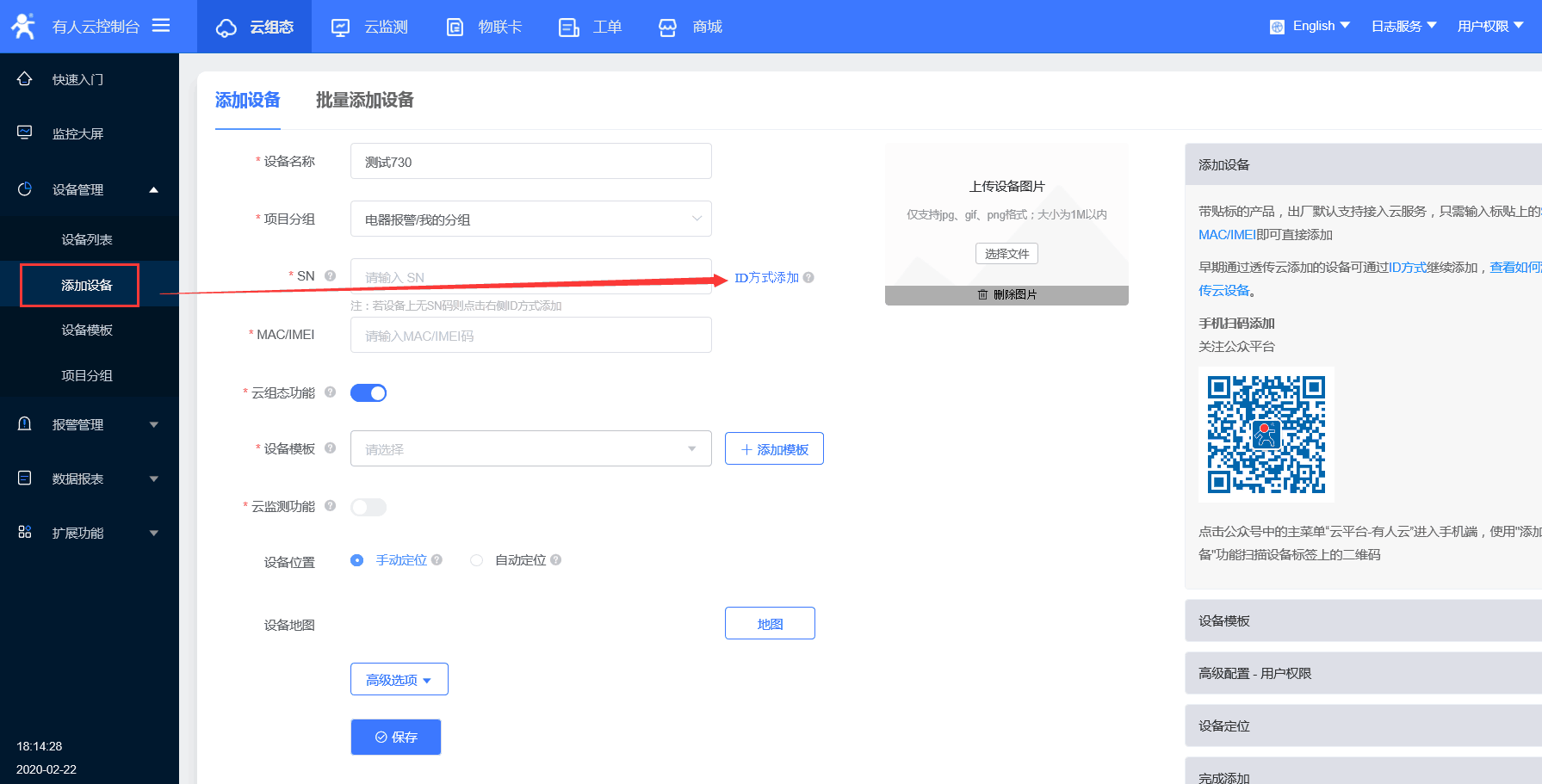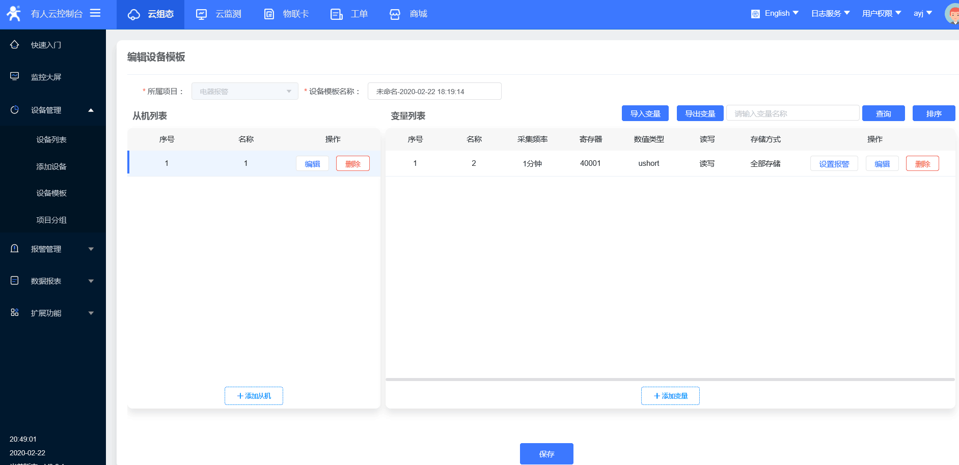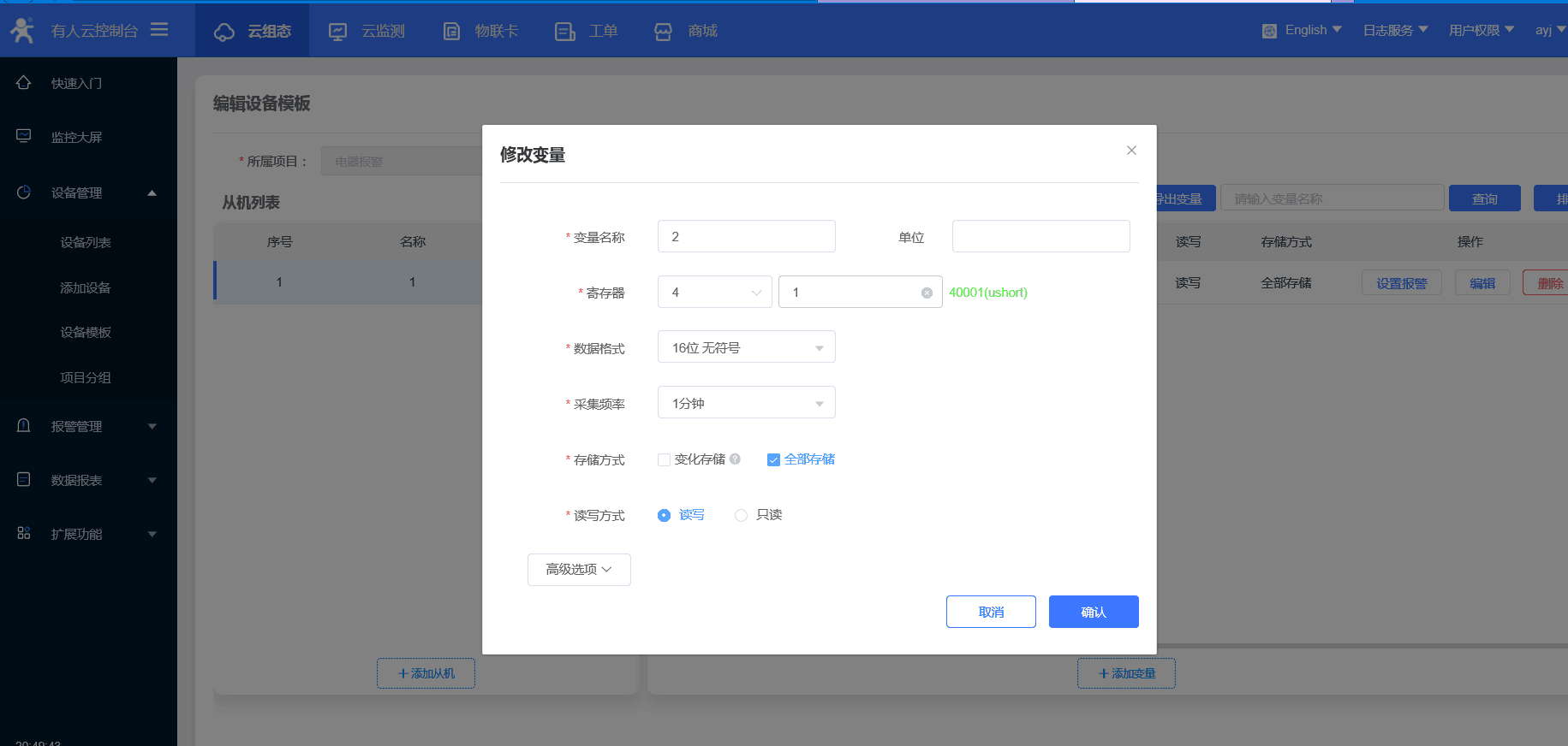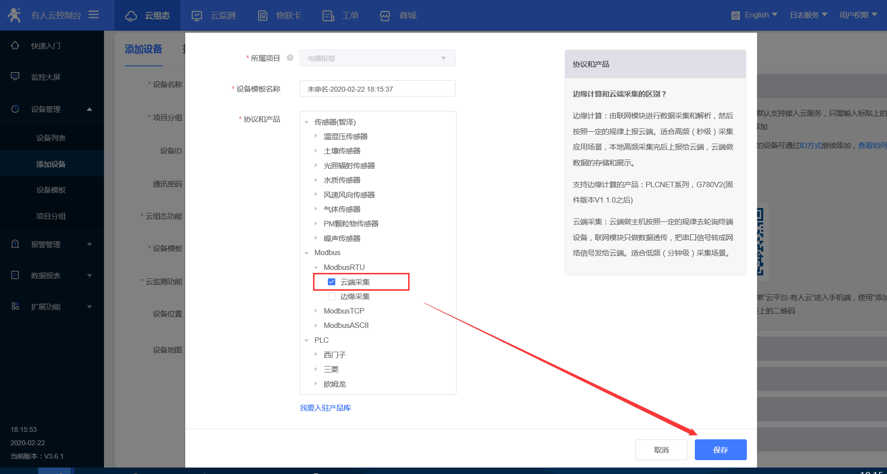 (1)点击添加设备(有人云以ID方式添加)-->点击添加模板-->Modbus-->Modbus RTU-->云端采集