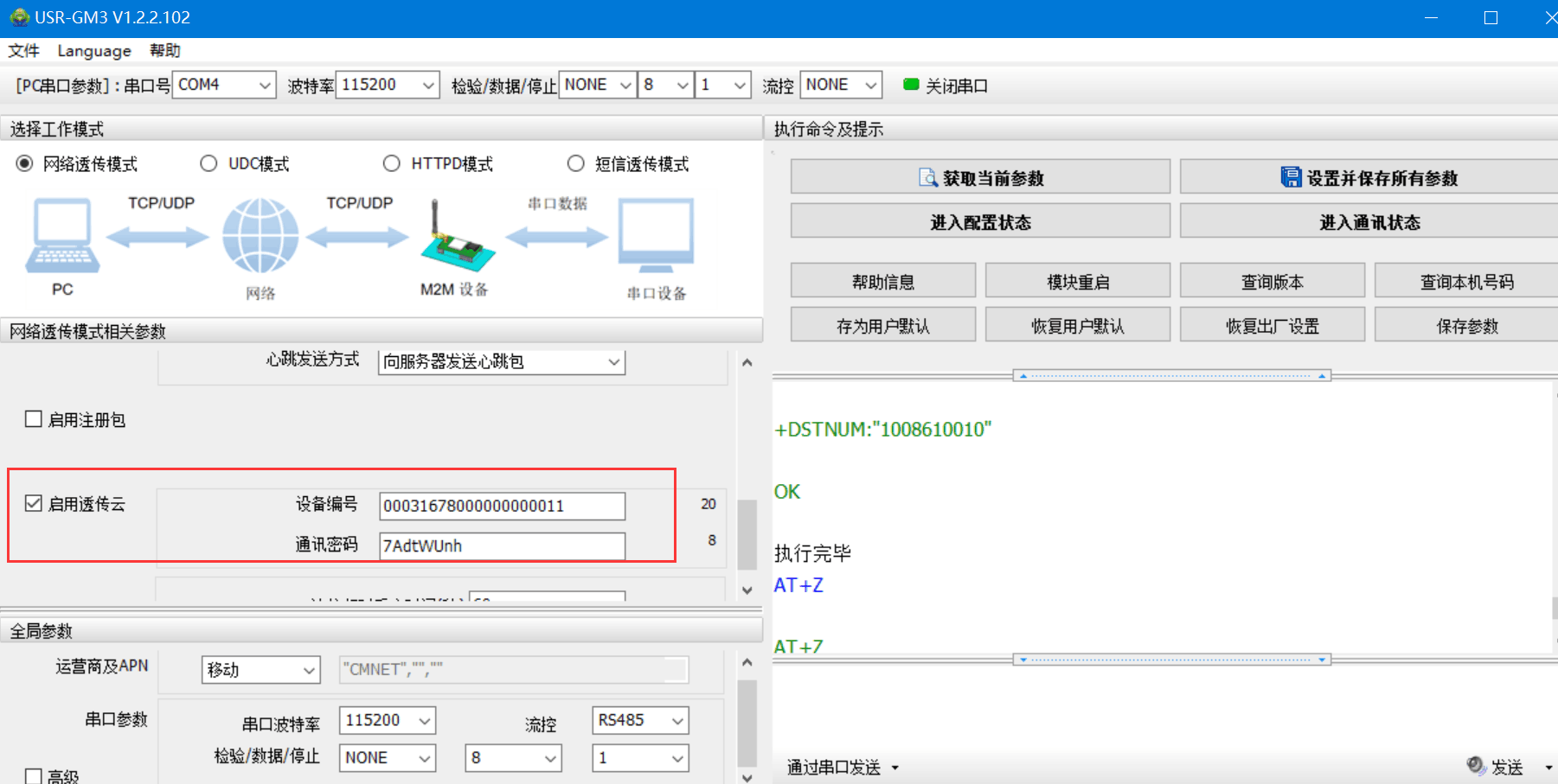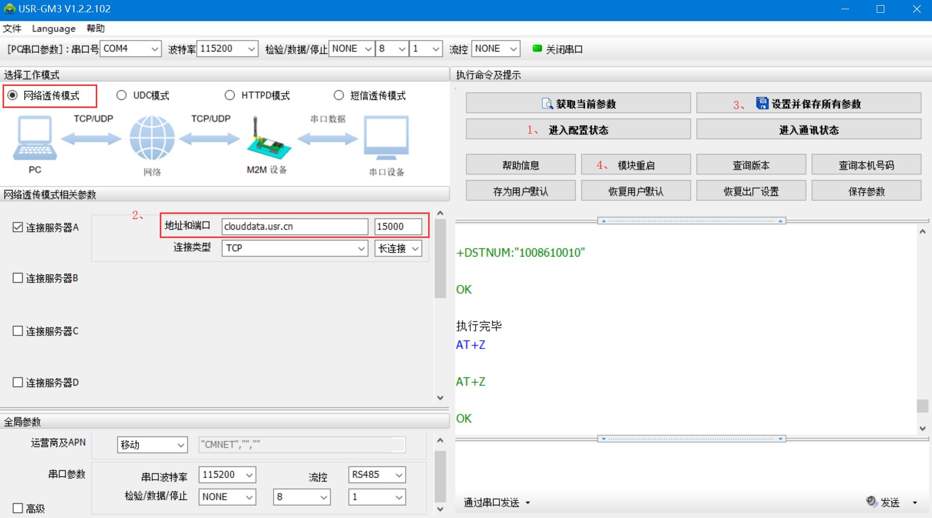 打开串口-->进入配置状态-->返回OK成功进入配置状态-->配置网络透传模式相关参数-->设并保存所有参数-->模块重启