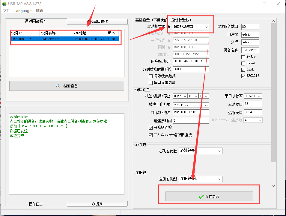 点击“搜索设备”,当搜索列表中出现306的设备后,单击搜索到的设备,此时是静态IP,因为306连接了一个可上网的路由器,把它设置为动态获取IP,然后保存,在重新搜索设备,然后设置配置信息并保存