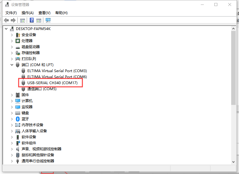 在设备管理器中查看端口信息,确定302串口使用的串口号,如下图所示电脑端口号为COM17