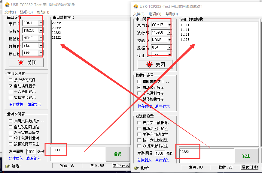 同时打开两个串口转网络助手软件。一个选择虚拟串口,一个选择COM17,即可进行收发测试