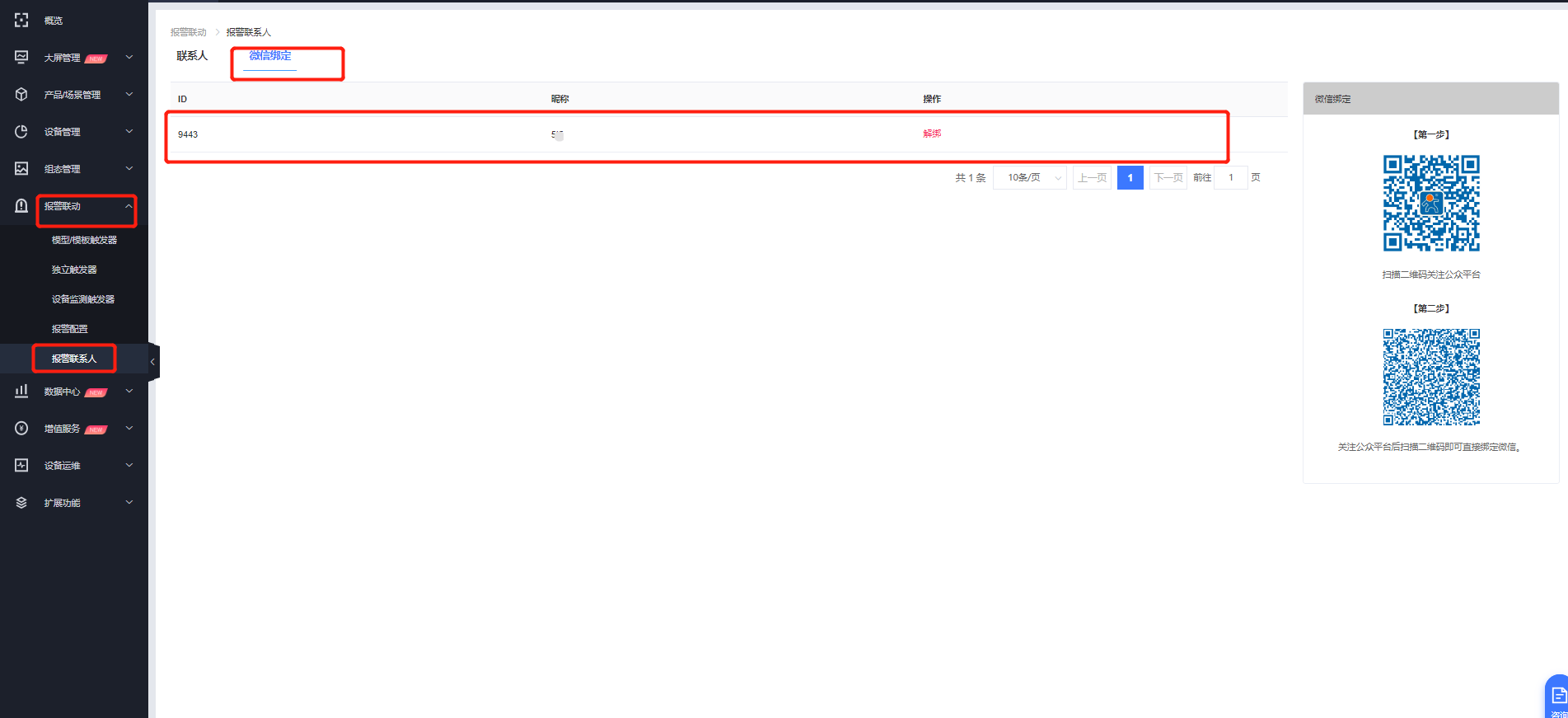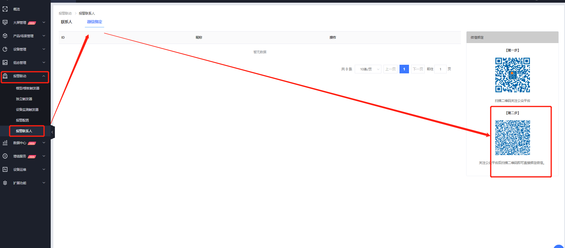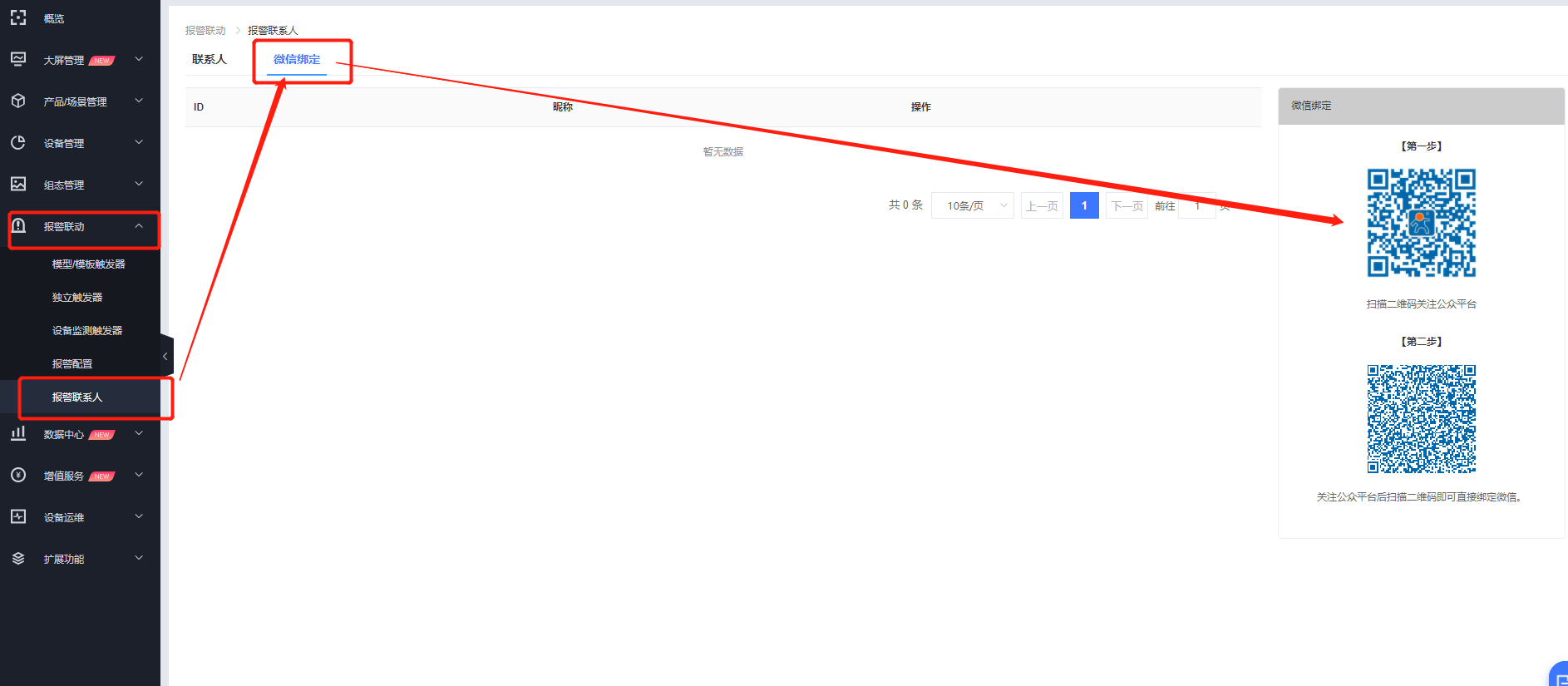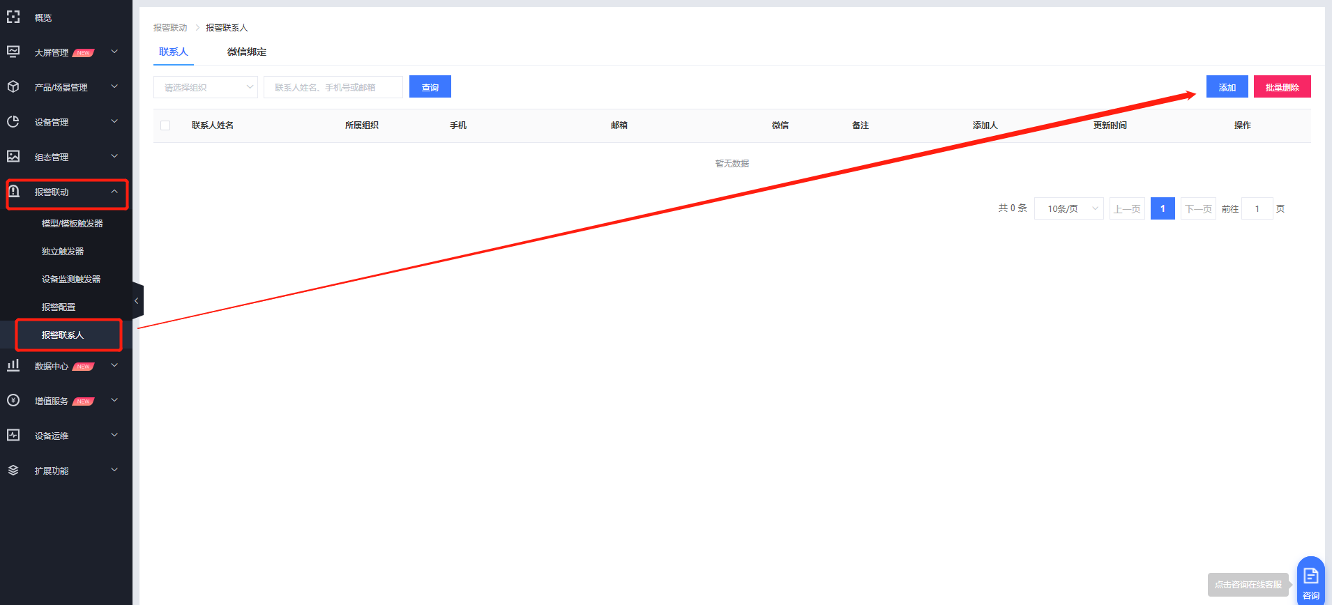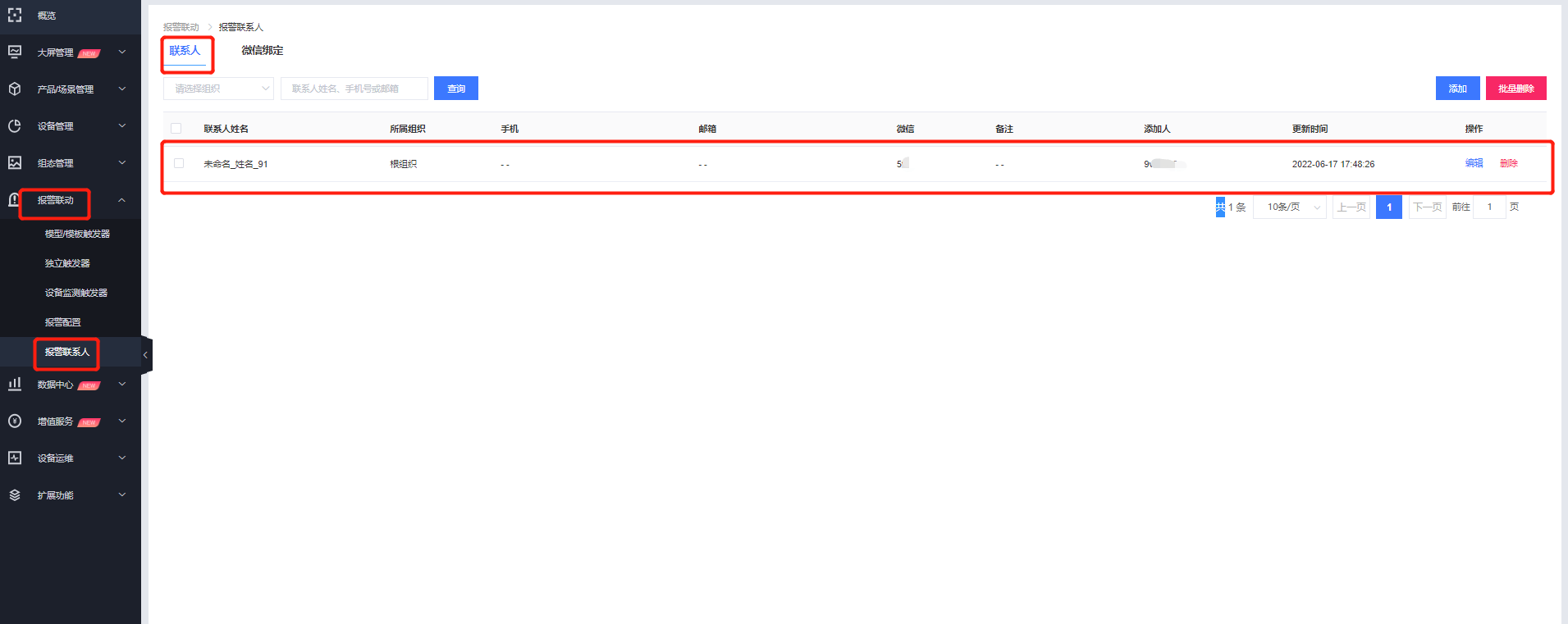 1、在“报警联动”--“报警联系人” 中,点击添加,添加报警联系人