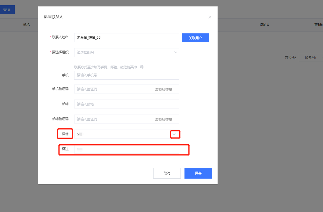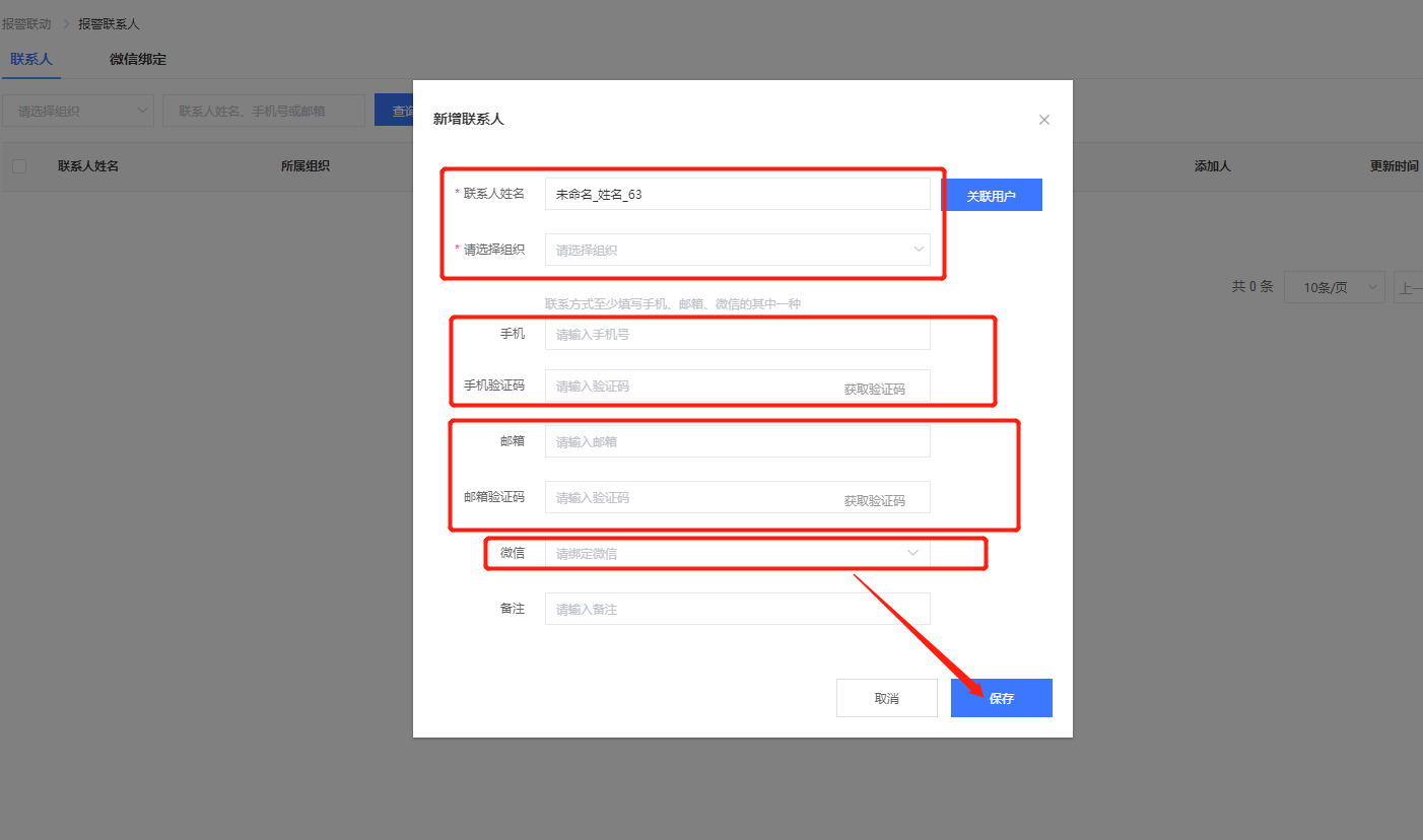 2、在弹出的对话框中,填写对应的信息,可选择 手机、邮箱、微信 三种报警方式,可以都填写也可以选择性填写(至少添加一种方式),填写后点击保存。